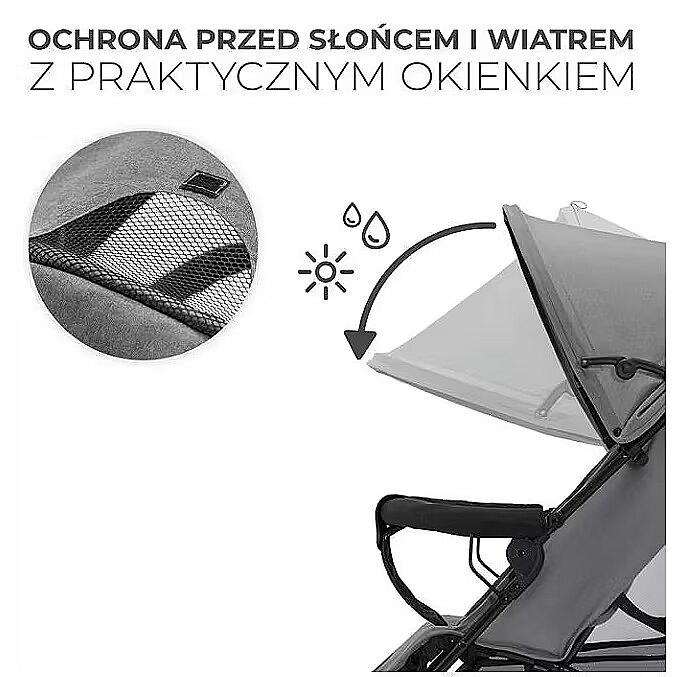 Children love naps during walks. To create a pleasant sleeping space for them, just unfold the backrest to a lying position and adjust the footrest. You will continue sightseeing, and your little one will rest after an eventful day. Foldable canopy