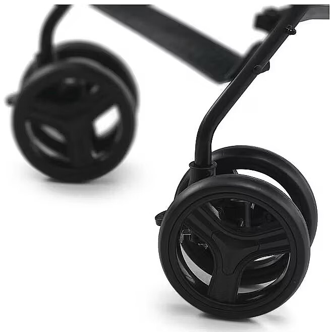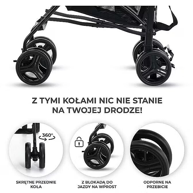 The stroller's wheels are light and puncture-proof, and most importantly: you don't have to inflate them. They will cope well with uneven surfaces, especially when you lock the front wheels to drive straight. Safe