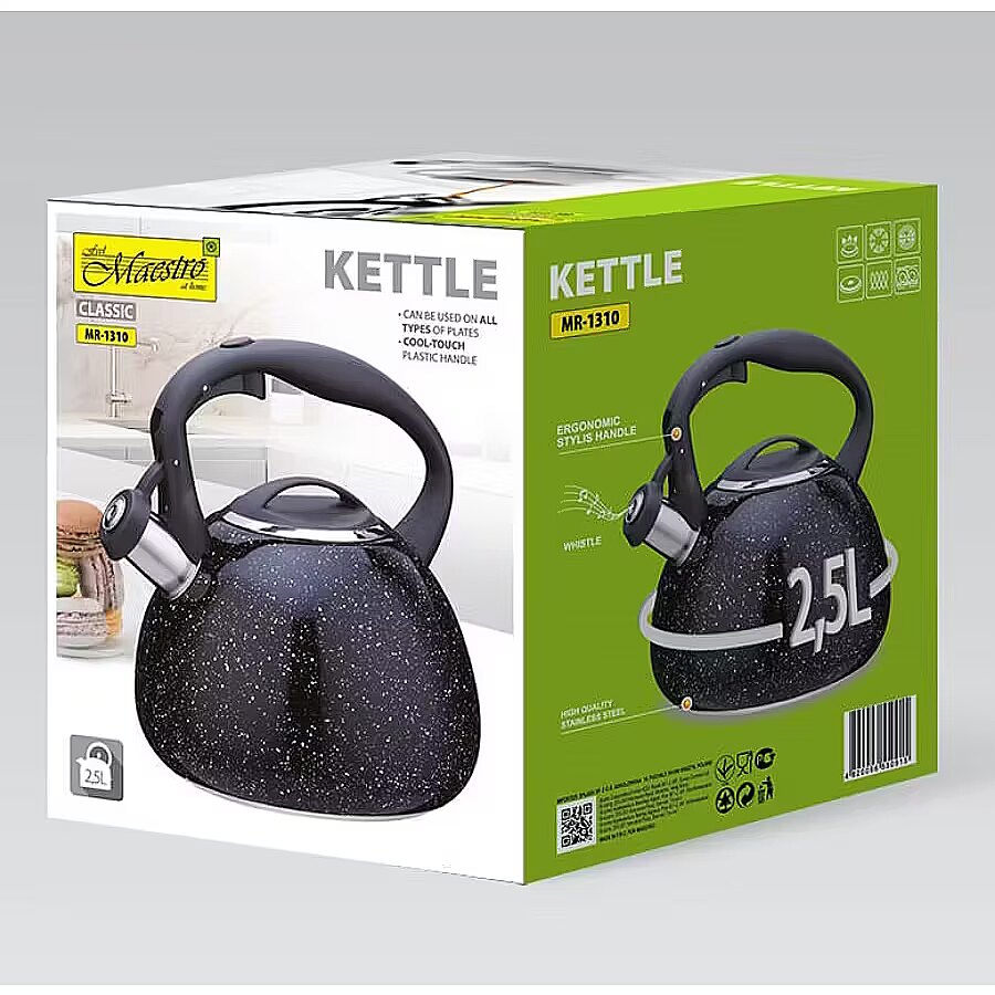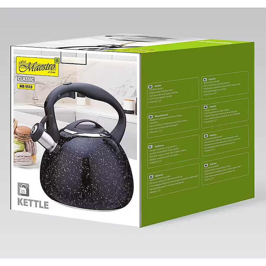 Description - Czajnik nieelektryczny Maestro MR-1310 to funkcjonalne urządzenie z gwizdkiem, które sprawdzi się w każdej kuchni. Wykonany z wysokiej jakości stali nierdzewnej, cechuje się solidnością oraz eleganckim wyglądem. Pojemność czajnika wynosi 2,5 litra, co umożliwia jednorazowe zagotowanie ilości wody, idealnej na herbatę lub kawę dla całej rodziny.