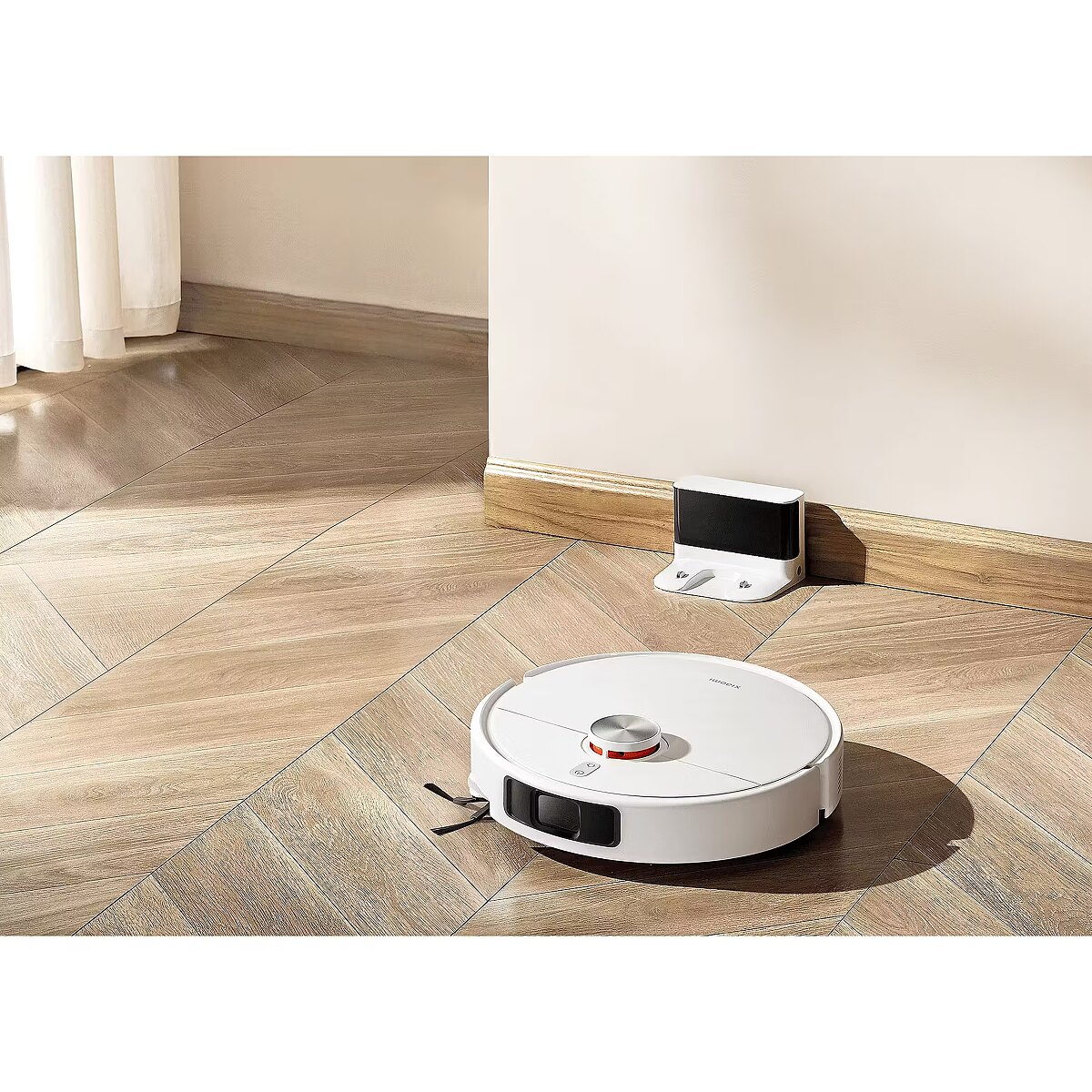When cleaning is complete, the vacuum returns to the charging dock and automatically retracts the mop pads. 129° wide-angle laser scanning is precise to the millimetre to avoid getting stuck