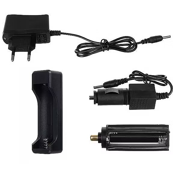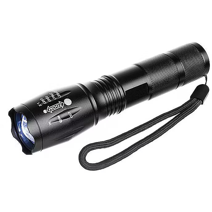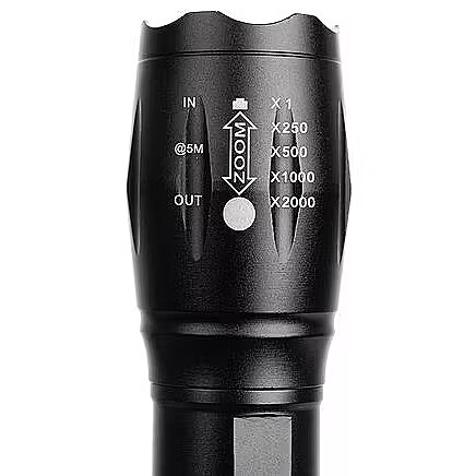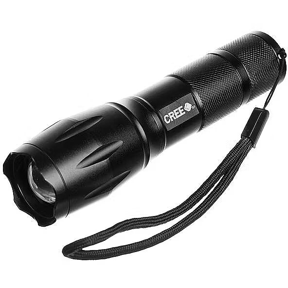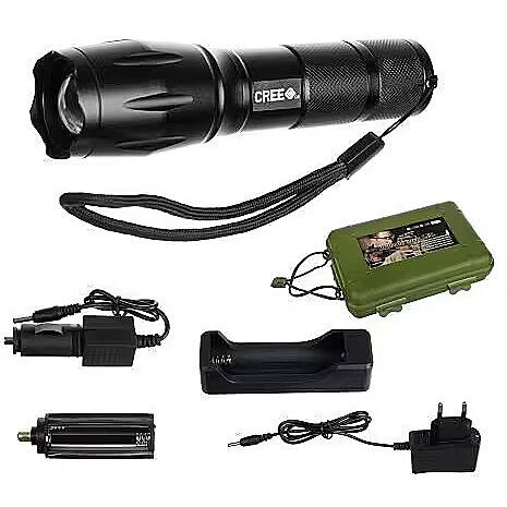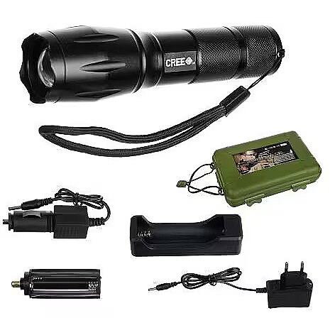 description_en - CREE LED T6 FLASHLIGHT BATTERY – the flashlight has a battery charged via a USB charger, which is included in the set. DURABLE AND WATERPROOF - it is made of aircraft aluminum, which makes it very solid and durable . The flashlight is waterproof. The switch is protected by solid rubber, and the O-rings used protect the device from liquid ingress. 3 LIGHTING MODES – the tactical flashlight can work in up to 3 different modes. These include: long mode, short mode, and alarm strobe mode. SMOOTH ZOOM ADJUSTMENT – the lamp has a smooth zoom adjustment, focuses the light beam from very wide to highly focused x1, x250, x500, x1000, x2000. SPECIFICATION - material: aluminum, others: polyester) in a case (dominant material: PP, others: foam; flashlight colour: black; diode: CREE 5W; power supply: battery; light colour: white; lens: convex lens; housing: aluminium; range: 200-300m (depending on weather conditions); 3 operating modes: 2 power levels + strobe; charging: USB charger; flashlight dimensions (L/W): 12.5-13.5 x 3cm; packaging dimensions (L/W/H): 15x5 cm; weight: 109g; weight with packaging: 169g. SPECIFICATION material: aluminum, others: polyester) in a case (dominant material: PP, others: foam