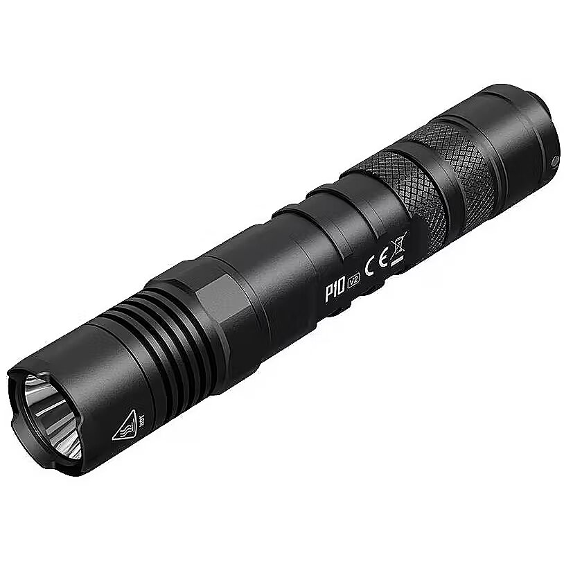 Summary - Nitecore P10 V2. Flashlight type: Tactical flashlight, Product colour: Black, Housing material: Aluminium. Waterproof up to: 1 m, Shockproof up to: 2 m, International Protection (IP) code: IP68. Lamp type: LED, Lamps quantity: 1 lamp(s), Light output (min): 60 lm. Battery type: 18650/CR123, Battery life (max): 55 h. Height: 148.3 mm, Weight: 95 g, Head diameter: 2.54 cm