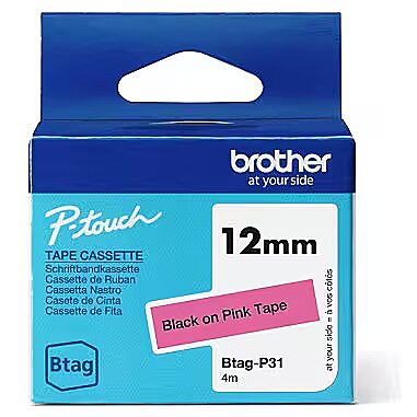 LongDesc - Brother original Btag-P31 Black on Pink 12mm tape is perfect for all-round home organisation. Create labels to organise items in the kitchen, bedroom storage, home office and personal items, as well as children’s school books and stationery.Btag tape is durable and offers resistance to many of the conditions present during everyday use in the home. Btag labels are microwave, freezer, dishwasher, household liquids and water resistant, meaning they’ll remain intact and legible over time.