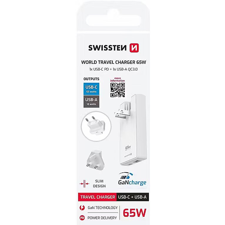 description_en - The SWISSTEN GaN Travel Adapter USB-C + USB-A 65W is the ideal solution for charging your devices anywhere in the world. With interchangeable plugs (A, B, C, E, G), it is compatible with most electrical outlets, making it the perfect travel companion. Powerful charging on your journeys