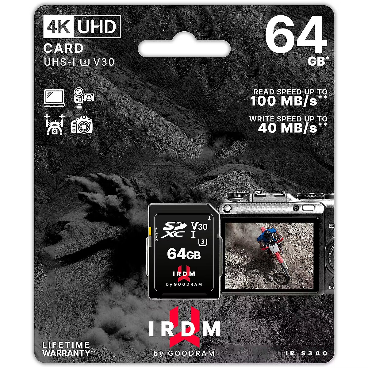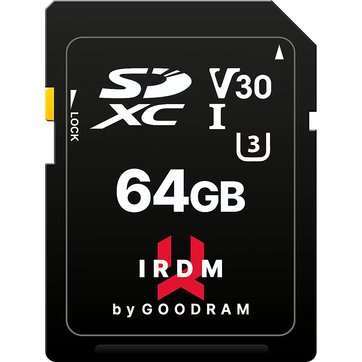 LongSummaryDescription - Goodram IRDM. Capacity: 64 GB, Flash card type: SDXC, Internal memory type: UHS-I, Read speed: 100 MB/s, Write speed: 70 MB/s, UHS Speed Class: Class 3 (U3), Video Speed Class: V30. Protection features: Shock resistant, Water resistant, X-ray proof, Product colour: Black