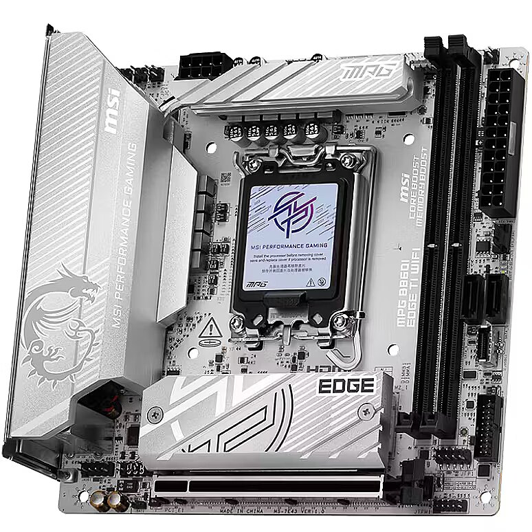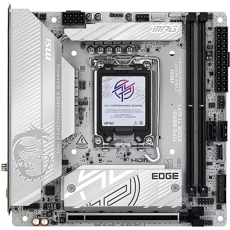 LongSummaryDescription - MSI MPG B860I EDGE TI WIFI. Processor manufacturer: Intel, Processor socket: LGA 1851 (Socket V1), Compatible processor series: Intel Core Ultra (Series 2). Supported memory types: DDR5-SDRAM, Maximum internal memory: 128 GB, Memory slots type: DIMM. Supported storage drive interfaces: M.2, SATA, Supported storage drive types: HDD & SSD, RAID levels: 0, 1. Ethernet interface type: 5 Gigabit Ethernet, Top Wi-Fi standard: Wi-Fi 7 (802.11be), Wi-Fi standards: 802.11a, 802.11b, 802.11g, Wi-Fi 4 (802.11n), Wi-Fi 5 (802.11ac), Wi-Fi 6 (802.11ax), Wi-Fi 7.... Component for: PC, Motherboard form factor: mini ITX, Motherboard chipset family: Intel