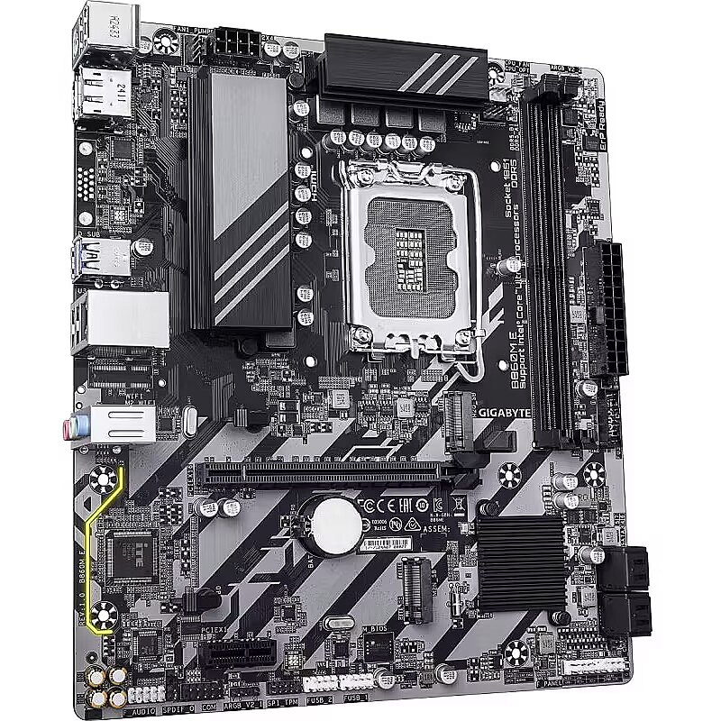 description_en - The Gigabyte B860M E 1.0 motherboard is designed for Intel processors using the LGA1851 socket and the Intel B860 chipset. It supports DDR5 memory, offers two DIMM slots, two PCIe 4.0 M.2 connectors, multiple expansion slots, and a full range of connectivity options. Its microATX form factor makes it suitable for compact yet powerful PC builds.