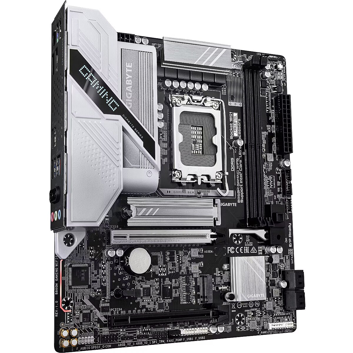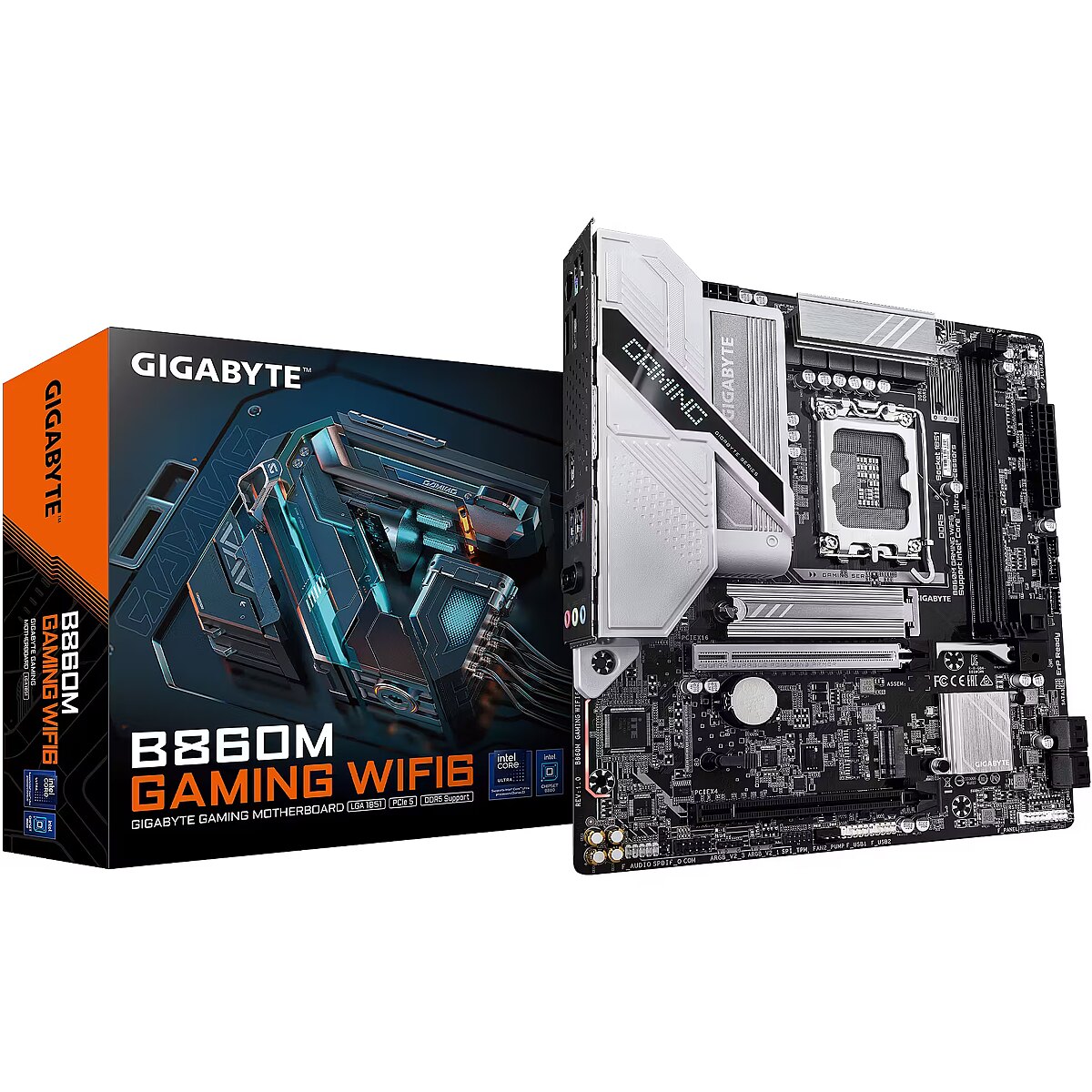 Summary - GIGABYTE B860M GAMING WIFI6 Motherboard - Intel Core Ultra Series CPUs, 8+1+2 Phases VRM, up to 9066MHz DDR5, 1xPCIe 5.0 + 1xPCIe 4.0 M.2, 2.5GbE LAN, WIFI 6, USB 3.2 Gen 1. Processor manufacturer: Intel, Processor socket: LGA 1851 (Socket V1), Compatible processor series: Intel® Core™ Ultra (Series 1), Intel Core Ultra (Series 2). Supported memory types: DDR5-SDRAM, Maximum internal memory: 128 GB, Memory slots type: DIMM. Supported storage drive interfaces: M.2, SATA III, Supported storage drive types: HDD & SSD, RAID levels: 0, 1, 5, 10. Maximum resolution: 4096 x 2160 pixels. Ethernet interface type: 2.5 Gigabit Ethernet, LAN controller: Realtek RTL8125, Top Wi-Fi standard: Wi-Fi 6E (802.11ax)