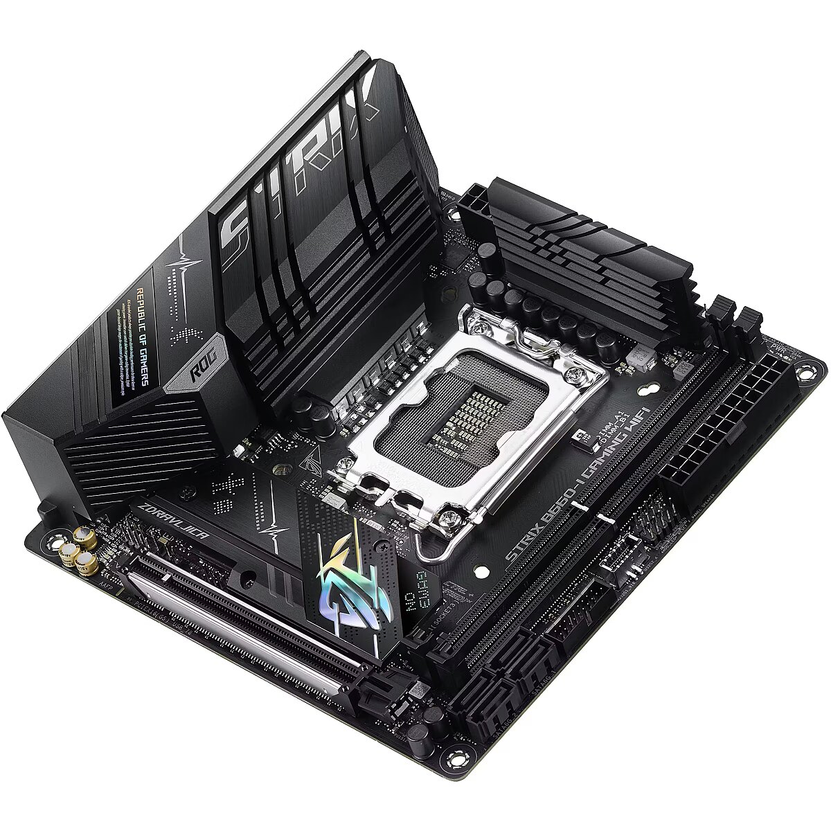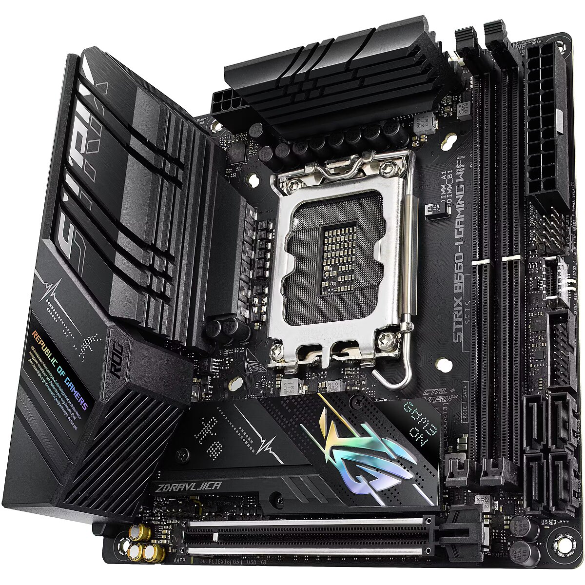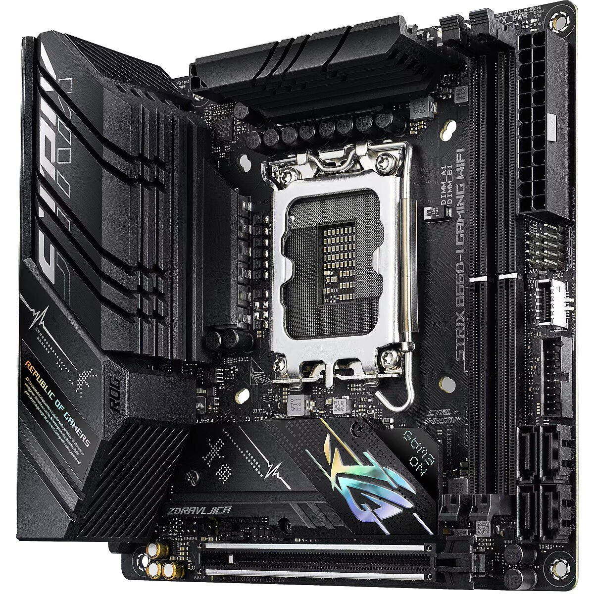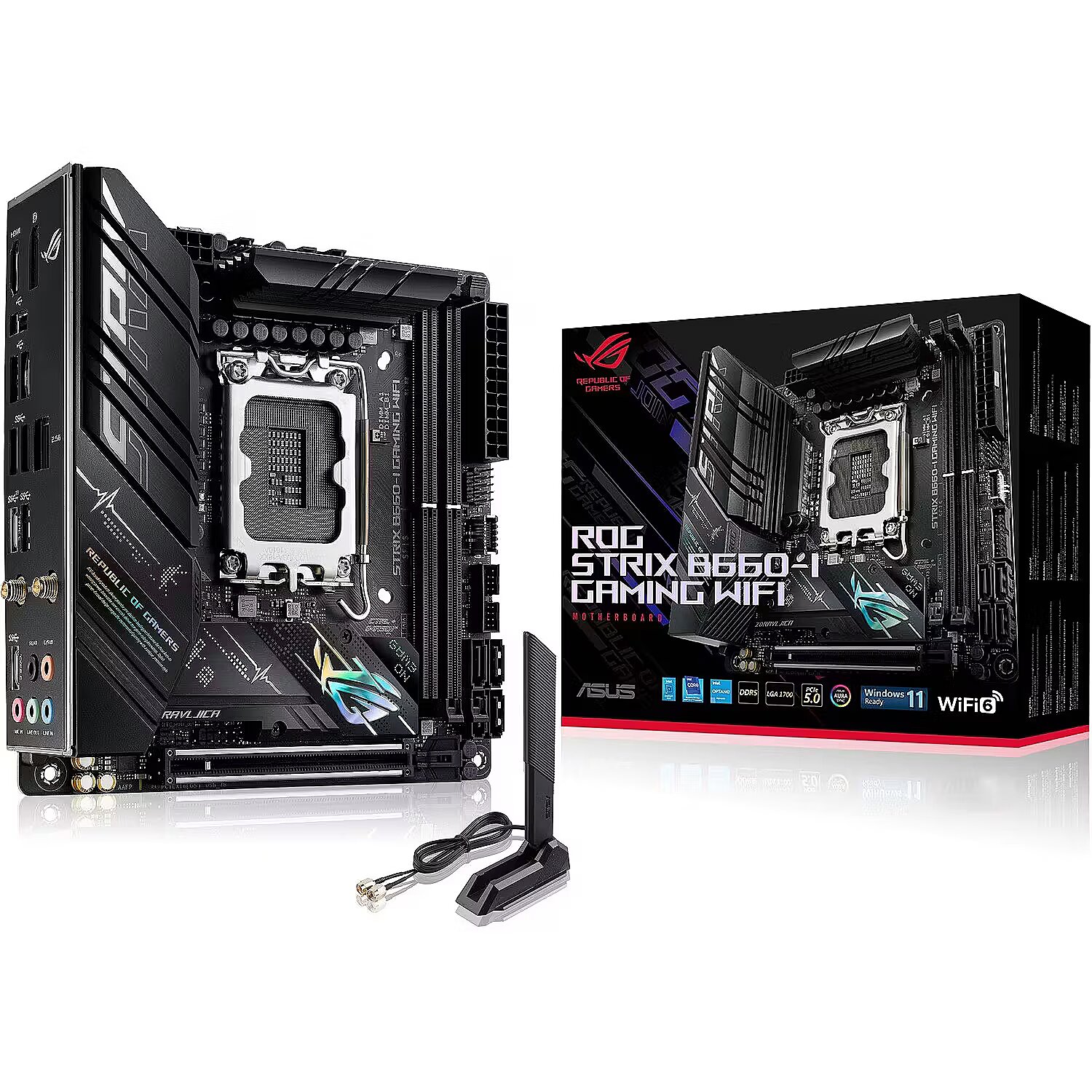 LongDesc - The ROG Strix B660-I Gaming WiFi packs premium-grade power delivery into a compact mini-ITX form factor to unleash the full force of 12th Gen Intel® Core™ processors. Framerates and load times can be boosted even further by all-new support for DDR5 memory and PCIe® 5.0, plus AI-enhanced controls and exclusive ASUS Enhanced Memory Profile tuning. Meanwhile, onboard WiFi 6 and two PCIe 4.0 M.2 slots bring lightning-fast performance to an endless variety of scenarios. On top of all that, DIY-friendly innovations help simplify the PC building process, so even novice builders can get right into serious gaming.TEAMED POWER STAGES8+1 power stages combine high-side and low-side MOSFETS and drivers into a single package, delivering the power and efficiency that the latest Intel processors can take full advantage of.ALLOY CHOKES AND DURABLE CAPACITORSHigh-end chokes and durable capacitors are engineered to resist extreme temperatures, enabling performance that exceeds industry standards.PROCOOL POWER CONNECTORThe ASUS ProCool socket is built to exacting specifications to ensure flush contact with the PSU power lines, enabling lower impedance and better heat dissipation.DIGI+ POWER CONTROLThe Digi+ voltage regulator module (VRM) is one of the finest in the industry, ensuring ultra-smooth and clean power delivery to the CPU.EIGHT-LAYER PCBA multi-layered printed circuit board design quickly dissipates heat around the voltage regulators to improve overall system stability and provide the CPU with more overclocking headroom.OOLER BY DESIGNROG Strix B660 motherboards feature comprehensive cooling options that configurable via the Fan Xpert 4 tool in Armoury Crate or within the UEFI BIOS.TWO-WAY AI NOISE CANCELATIONThis powerful ASUS-exclusive utility leverages a massive deep-learning database to reduce background noise from the microphone* and incoming audio while preserving voices. Distracting keyboard clatter, mouse clicks and other ambient noises are removed so you can hear and be heard with perfect clarity while gaming or during calls.*A splitter cable is necessary when using a 3.5 mm headset.AI COOLINGASUS AI Cooling technology automatically manages and controls motherboard-connected fans to ensure optimal settings based on current system load and temperature.AI NETWORKINGThe proprietary ROG GameFirst VI utility is designed to help all users — beginners, experts, and everyone in between — optimize network settings to ensure smooth online gameplay. New to this generation, GameFirst VI features AI-enhanced identification and boost technologies to ensure faster and smarter network optimization.IdentificationGameFirst VI analyzes usage patterns and the digital signatures of your applications and compares them to a database of over 200,000 apps.BoostGameFirst VI intelligently switches application priority and adjusts bandwidth, depending on the situation. When gaming, it accelerates and prioritizes game packets to give you supersmooth online gameplay ― even when you're streaming high-quality video or transferring large files.VisualizationAn intuitive graph provides an overview of real-time network status. Simply click on the tab to view the current bandwidth usage of each application, geolocation status of each network connection, or an analysis of the WiFi channels.DDR5 overclocking strengthComprehensive memory tuning options are the cornerstone of ROG motherboards. For DDR5, ROG Strix B660-I Gaming WiFi breaks performance limits by providing a stacked suite of overclocking parameters for not only high-speed kits, but even entry-level memory modules that have a locked power management IC (PMIC).A dedicated circuit on the motherboard safely circumvents DDR5 memory PMIC restrictions, allowing you to step past the default 1.1-volt limit and push frequency and timings to the max.Ordinarily, a restricted PMIC that has been unlocked requires the system to be fully power-cycled each time memory voltage is adjusted. ROG motherboards leverage onboard hardware and firmware to cleverly work around this irksome limitation, enabling voltage adjustments to be applied through the same soft system-reset process employed for previous generations of DDR memory.For users new to memory overclocking, ROG Strix B660-I Gaming WiFi includes the exclusive ASUS Enhanced Memory Profile (AEMP)* firmware feature for PMIC-restricted memory modules.WIFI 6 (802.11 AX)Onboard WiFi 6 (802.11ax) supports ultrafast wireless-networking speeds, improved capacity and better performance in dense wireless environments, providing exceptional online gaming experiences. Pair your motherboard with ASUS WiFi 6 routers to fully experience the networking potential of WiFi 6.Intel 2.5 Gb EthernetOnboard 2.5 Gb Ethernet gives your wired connection a boost, with up to a 2.5x improvement over standard Ethernet connections for faster file transfers, smoother lag-free gaming and high-res video streaming.SUPREMEFXROG SupremeFX is a unique blend of hardware and software that provides superior audio. In ROG Strix B660-I Gaming WiFi, SupremeFX features the S1220A codec to increase playback resolution from 192 kHz to 384 kHz across all channels. The front-panel output is streamed through a highly integrated Savitech amplifier that’s capable of driving of a wide variety of gaming headsets and high-fidelity headphones.UNDENIABLY ROG STRIXThe stealthy black aesthetic of ROG Strix B660-I Gaming WiFi is complemented by an iridescent ROG logo on the M.2 heatsink cover, touches of pixelated retro gaming art, and an understated but stylish Strix nameplate on the I/O shroud.M.2 Q-LATCHThe innovative Q-Latch makes it easy to install or remove an M.2 SSD without the need for specific tools. The design employs a simple locking mechanism to secure the drive and neatly eliminate traditional screws.CERTIFIED COMPATIBILITYROG Strix motherboards undergo an extensive certification program to ensure compatibility with the widest range of components and de