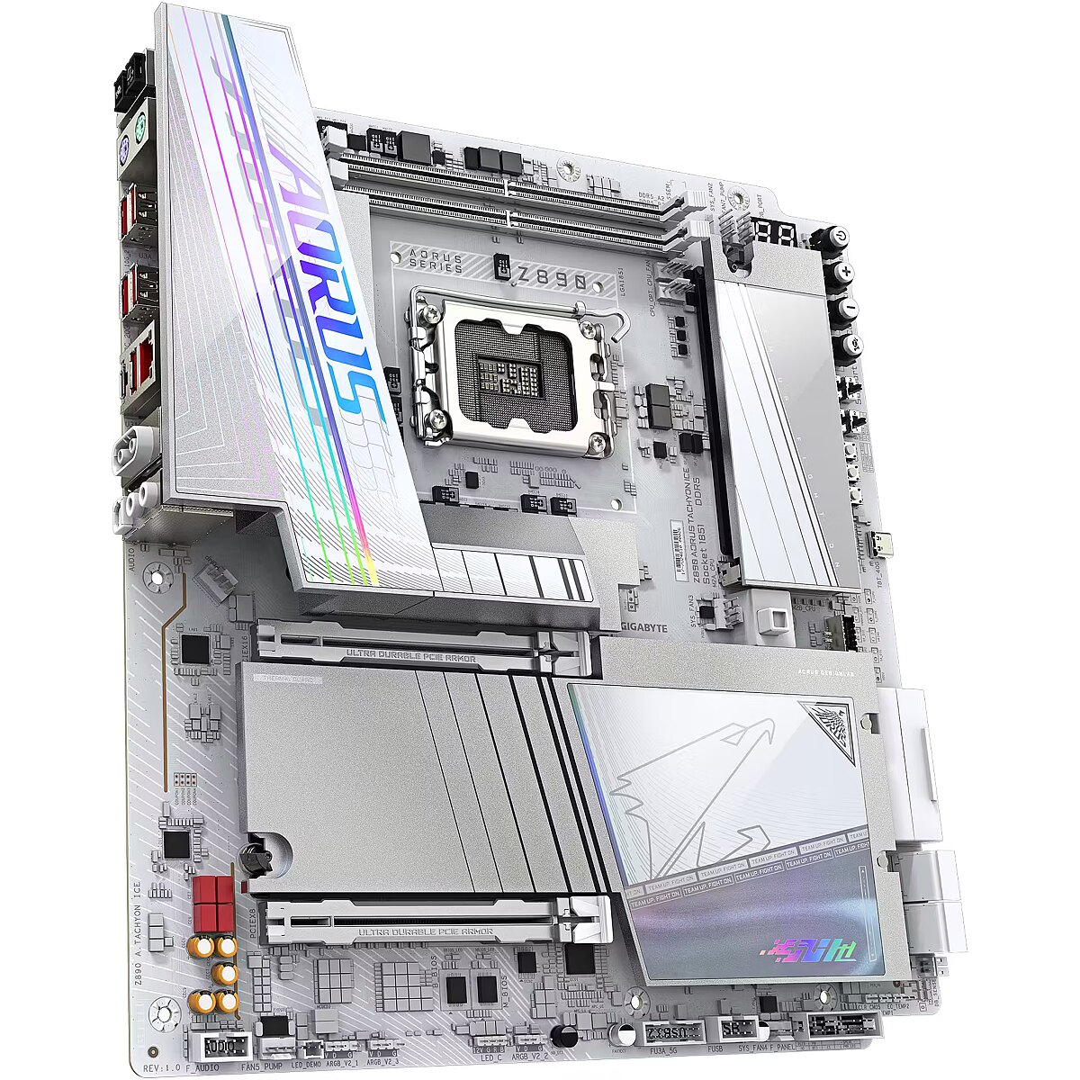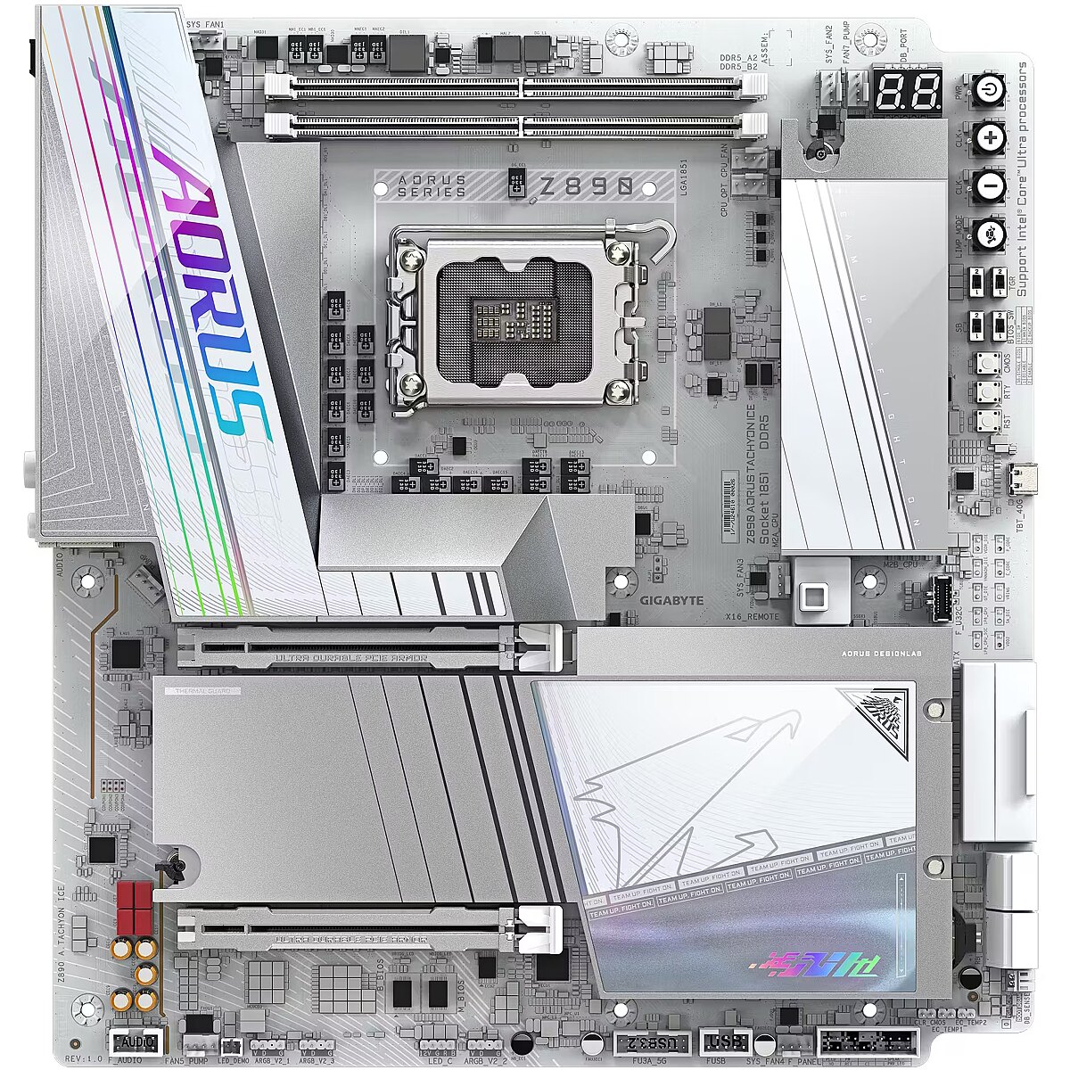 ShortSummaryDescription - GIGABYTE Z890 AORUS TACHYON ICE Motherboard - Supports Intel Core Ultra (Series 2) CPUs, 18+1+2 phases VRM, up to 9500MHz DDR5 (O.C), 1xPCIe 5.0 + 3xPCIe 4.0, Wi-Fi 7, 5GbE LAN, USB 3.2 Gen 2x2, Intel, LGA 1851 (Socket V1), Intel Core Ultra (Series 2), LGA 1851, DDR5-SDRAM, 128 GB