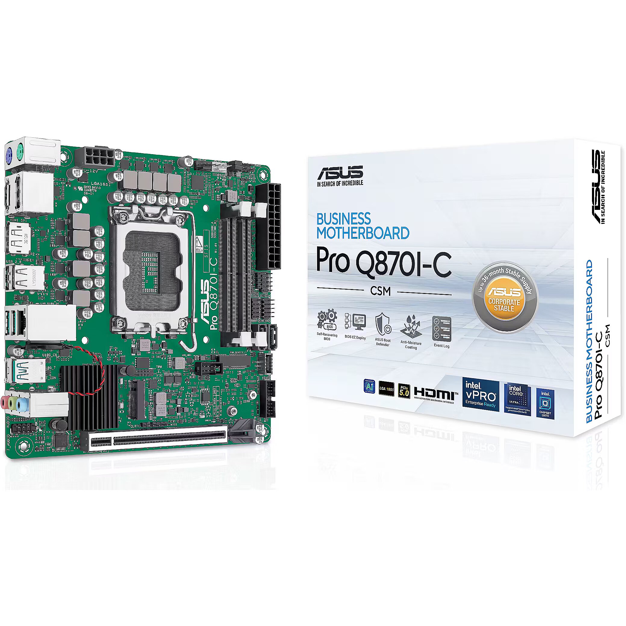 LongSummaryDescription - ASUS PRO Q870I-C-CSM. Processor manufacturer: Intel, Processor socket: LGA 1851 (Socket V1), Compatible processor series: Intel Core Ultra (Series 2). Supported memory types: DDR5-SDRAM, Maximum internal memory: 128 GB, Memory slots type: SO-DIMM. Supported storage drive interfaces: M.2, SATA III, Supported storage drive types: HDD & SSD. Ethernet interface type: Fast Ethernet, Gigabit Ethernet, LAN controller: Intel WGI219LM. Component for: PC, Motherboard form factor: mini ITX, Motherboard chipset family: Intel