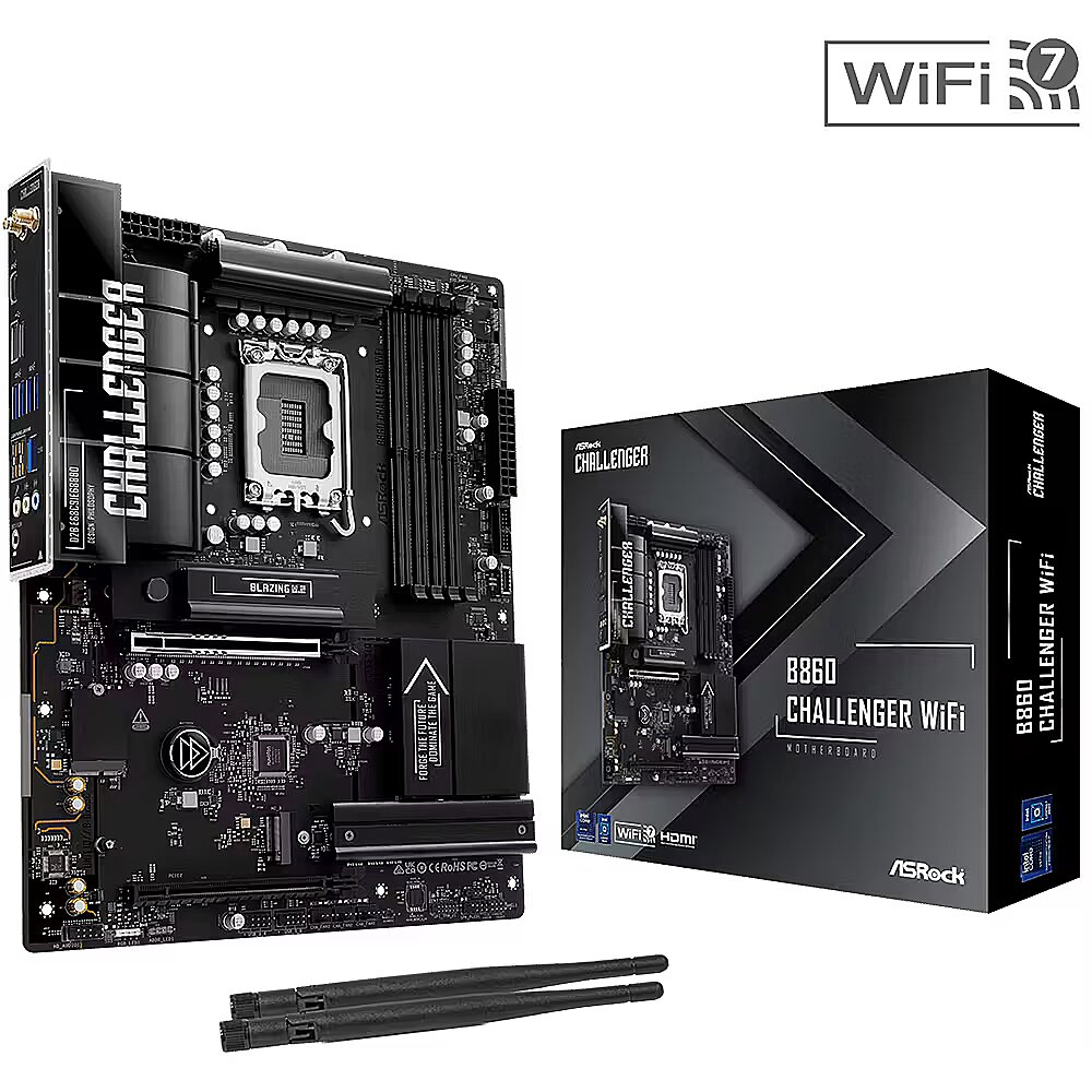 Summary - Asrock B860 Challenger WiFi. Processor manufacturer: Intel, Processor socket: LGA 1851 (Socket V1), Compatible processor series: Intel Core Ultra (Series 2). Supported memory types: DDR5-SDRAM, Maximum internal memory: 256 GB, Memory slots type: DIMM. Supported storage drive interfaces: PCI Express 5.0, M.2, SATA III, Supported storage drive types: HDD & SSD, RAID levels: 0, 1, 5, 10. Ethernet interface type: 2.5 Gigabit Ethernet, Fast Ethernet, Gigabit Ethernet, LAN controller: Dragon RTL8125BG, Top Wi-Fi standard: Wi-Fi 7 (802.11be). Component for: PC, Motherboard form factor: ATX, Motherboard chipset family: Intel