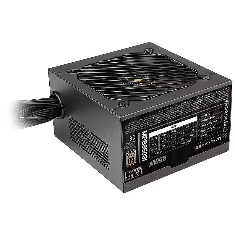 LongSummaryDescription - Mars Gaming MPB850SI. Total power: 850 W, AC input voltage: 200 - 240 V, AC input frequency: 47 - 63 Hz. Motherboard power connector: 24-pin ATX, Cabling type: Non-Modular. Purpose: PC, Power supply unit (PSU) form factor: ATX, 80 PLUS certification: 80 PLUS Bronze. Product colour: Black, Cooling type: Active, Fan diameter: 12 cm. Compliance certificates: CE, RoHS, TÜV mark