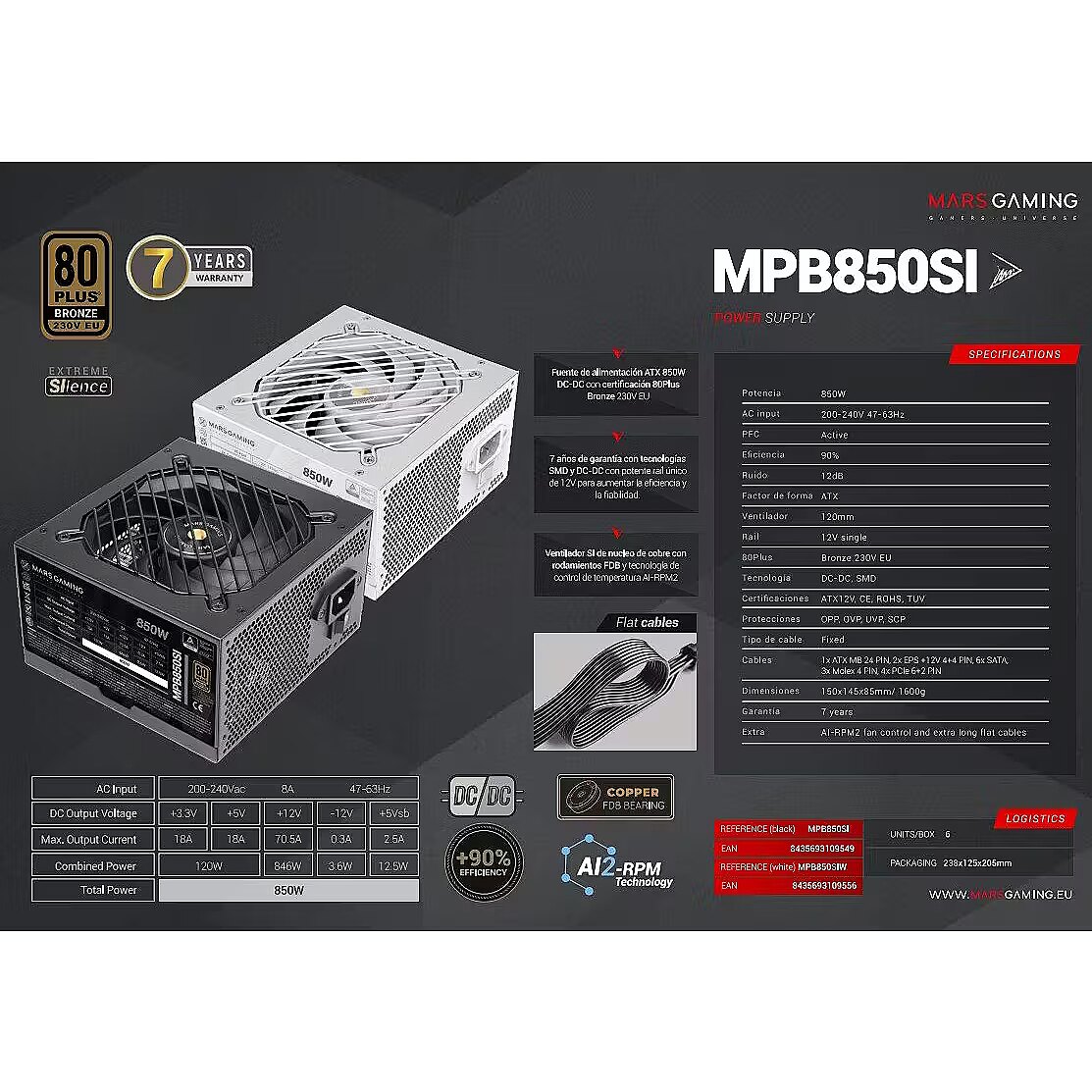LongDesc - Extreme Silence MPB850SI Power SupplyThe MPB850SI 850W ATX power supply combines power, efficiency, and absolute silence with cutting-edge technology. Equipped with an SI fan with a copper and aluminum core, FDB bearings, and the innovative AI2-RPM system, it automatically adjusts its speed using artificial intelligence and machine learning to achieve the perfect balance between cooling and silent operation. With a 7-year warranty, 80 Plus Bronze 230V EU certification, and advanced protection systems, the MPB850SI ensures safety, durability, and efficiency for the most demanding configurations.Extreme Silence with Advanced TechnologyExperience ultra-quiet performance with the MPB850SI, designed to operate distraction-free even under heavy loads. Its SI fan with a copper and aluminum core and FDB bearings minimizes friction, ensuring greater durability and stable operation. The advanced heat dissipation structure and airflow acceleration channels guarantee optimal cooling, maximizing energy efficiency and system stability.Black and whiteChoose the one that best suits your set-upComprehensive Protection. 7-Year WarrantyWith a 7-year warranty, the MPB850SI protects your hardware from overloads, short circuits, and electrical fluctuations with an advanced safety system: OVP, UVP, OCP, OPP, and SCP. Certified by TÜV Rheinland, one of Germany’s most recognized quality and safety laboratories, it guarantees unmatched reliability and security.Smart Control AI2-RPMThe AI2-RPM technology dynamically adjusts the fan speed based on system load using machine learning and artificial intelligence, ensuring maximum performance with minimal noise. The MPB850SI optimizes cooling and efficiency without generating unnecessary noise, adapting automatically to every situation.80PLUS BRONZE CertificationWith over 90% efficiency, the MPB850SI is 80 Plus Bronze 230V EU certified, reducing energy consumption while maintaining optimal system temperatures. Its efficient design allows for stable, silent, and sustainable operation, balancing power, performance, and energy savings.DC-DC and SMD Technologies: Unlimited PowerThe MPB850SI integrates DC-DC conversion technology, ensuring superior voltage stability, ideal for next-generation graphics cards and high-performance configurations. SMD technology enhances efficiency and durability, while its optimized design helps reduce energy consumption by up to 20%, ensuring precise regulation and superior component protection under any load condition.Premium CablingThe extra-long, black flat cables enhance cable management, ensuring a clean build and optimized airflow inside the case. A professional design for setups seeking the perfect balance between performance and aesthetics.