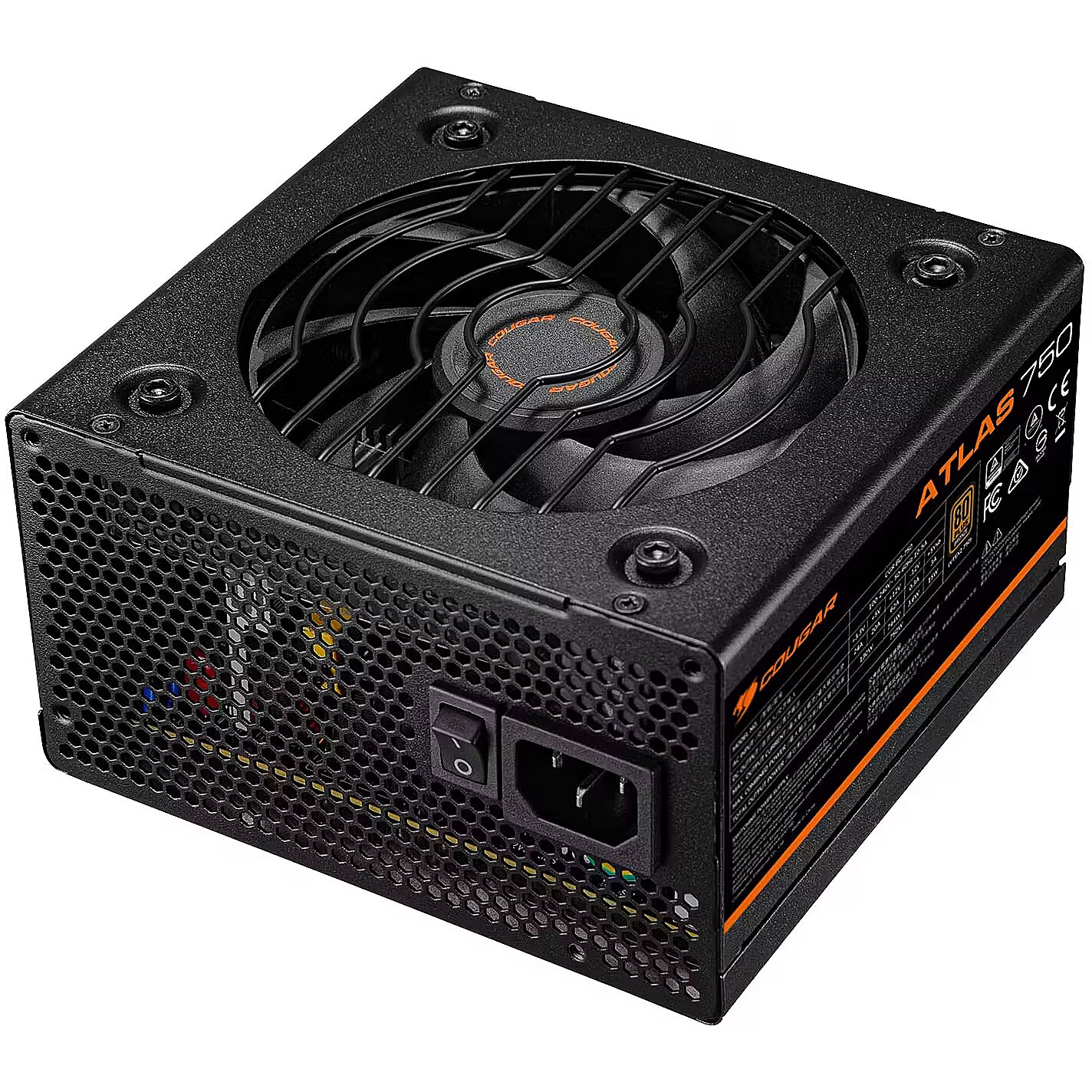 LongSummaryDescription - COUGAR Power Supply ATLAS 750W ATX / 80 Plus Bronze. Total power: 750 W, AC input voltage: 100 - 240 V, AC input frequency: 50/60 Hz. Motherboard power connector: 20+4 pin ATX, Motherboard power cable length: 55 cm, Peripheral (Molex) power cable length: 450 mm. Purpose: PC/Server, 80 PLUS certification: 80 PLUS Bronze. Product colour: Black, Cooling type: Active, Fan diameter: 12 cm. Compliance certificates: CCC, CE, EAC, Federal Communications Commission (FCC), RoHS