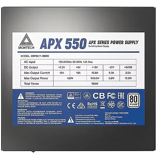 Summary - Montech APX550. Total power: 550 W, AC input voltage: 100 - 240 V, AC input frequency: 50/60 Hz. Motherboard power connector: 20+4 pin ATX. Purpose: PC, Power supply unit (PSU) form factor: ATX, 80 PLUS certification: 80 PLUS White. Product colour: Black, Fan diameter: 12 cm, Number of fans: 1 fan(s). Compliance certificates: CB, CE, EAC, Federal Communications Commission (FCC), RCM, RoHS, UKCA, cTUVus