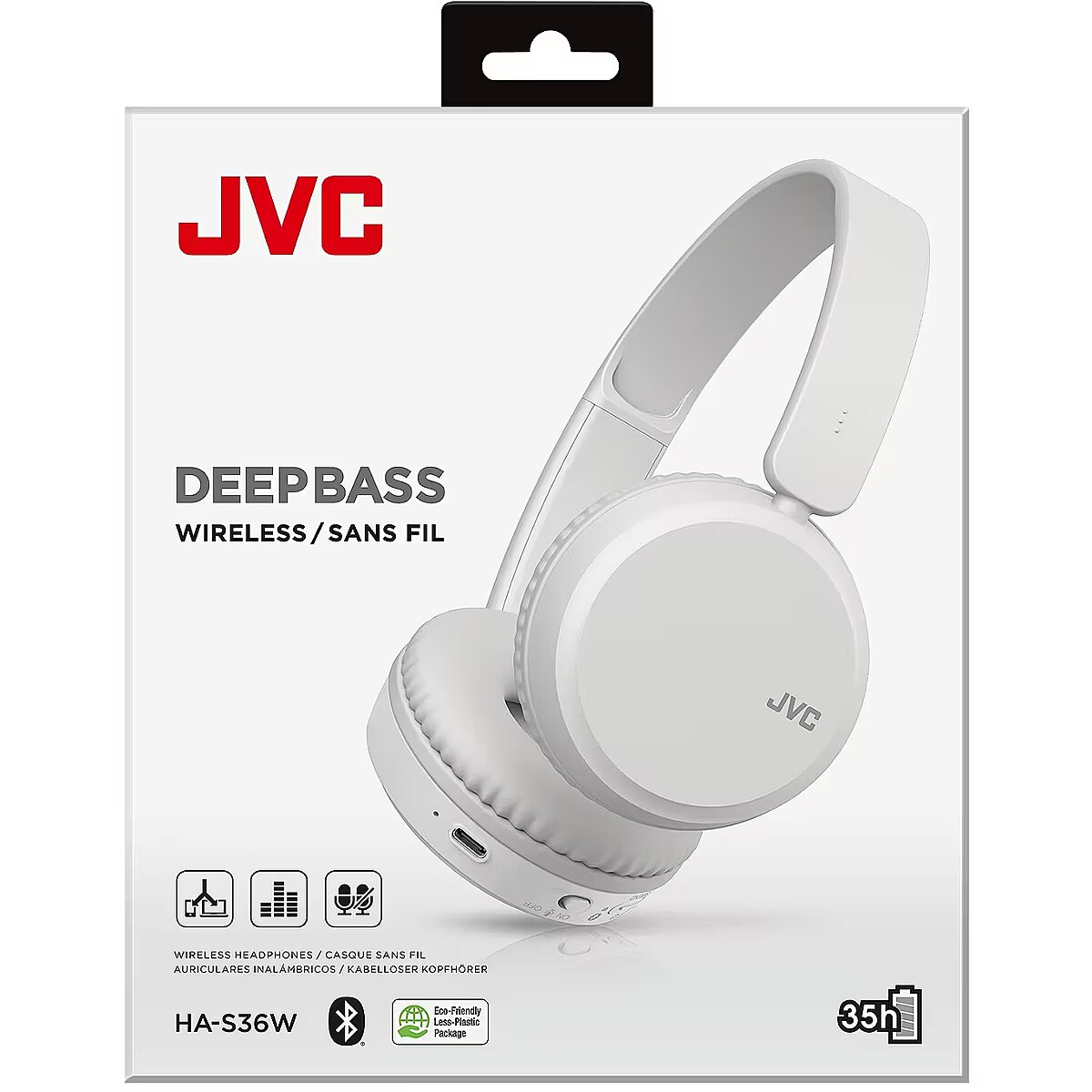 LongSummaryDescription - JVC Deep Bass Bluetooth On Ear White. Product type: Headset. Connectivity technology: Wireless, Bluetooth. Recommended usage: Calls/Music. Headphone frequency: 20 - 20000 Hz. Wireless range: 10 m. Weight: 157 g. Product colour: White