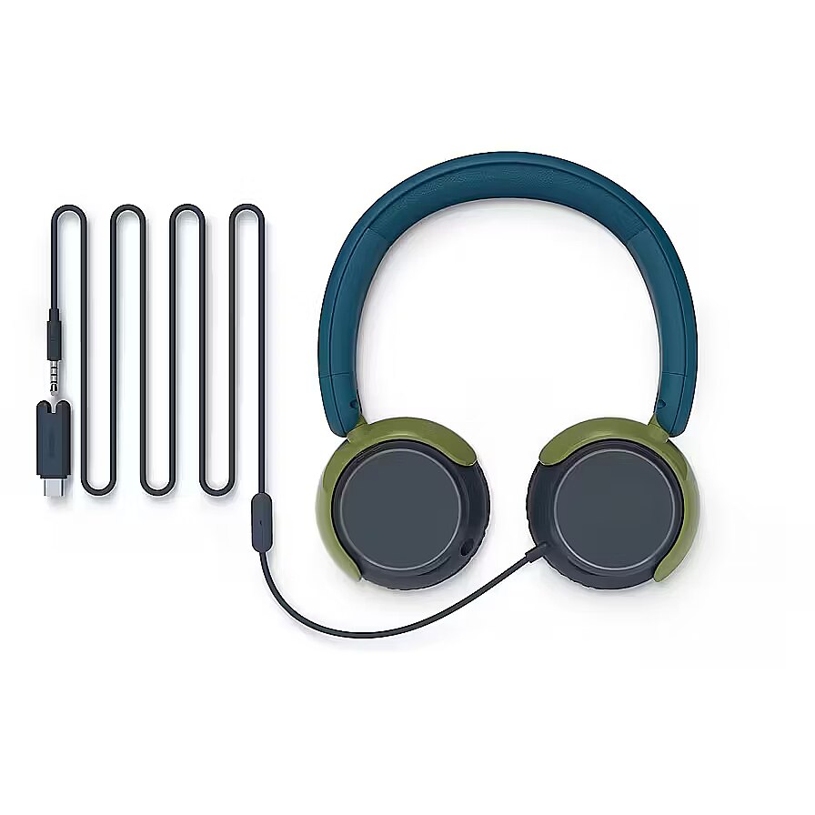 LongDesc - Always safe, always fun. Volume limited to 85 dBSpecially designed to be safe for young ears, these headphones have been volume limited to 85 dB. Music, cartoons, movies, educational videos: whatever they’re into, you can relax knowing they won’t be listening too loud.Kid-friendly comfort and easy to useSmaller ear cups with soft ear-cup cushions keep these lightweight headphones comfortable for kids. The cushioned headband also adjusts easily for the perfect fit and features dots on the back that help children see which way around to put the headphones on.Colorful design with customizable ear cupsThe multi-colored design makes the headphones stand out in all the right ways—and kids can customize their headphones using their own works of art! Simply lift the transparent ear-cup window, add their drawings or paintings, and click the window closed again.Audio sharing for double the funA built-in audio-sharing port means you can daisy chain these headphones so kids can listen together from the same device. Simply connect a standard 3.5 mm headphone cable to the audio-sharing port on these headphones, then plug the other end of the cable into the headphone socket on the second pair of headphones.Tough, durable, and foldableMade from durable, non-toxic materials, these headphones are built to withstand the rigors of daily use by kids. When not in use, they can be folded flat for easy storage in a drawer. Or you can fold them flat and inwards, creating a compact bundle that easily fits into pockets and bags.Compatible with most devices. 3.5 mm to USB-C cable in boxThese wired headphones connect to devices via USB-C, which makes them compatible with most laptops, phones, and tablets. The detachable USB-C headphone jack adapter with attached 3.5mm cable is included in the box.Clear calls with friends and familyA built-in microphone lets kids take calls with family and friends. A dedicated mic picks up the sound of their voice, while a noise-reduction algorithm quietens some of the background noise from the world around them.Warm, natural sound. Philips sound signatureMovies to music, they’ll love what they hear! These on-ear kids’ headphones feature large 32 mm drivers, tuned to the Philips sound signature. Whatever they’re into, they’ll enjoy a warm, natural sound with deep bass.Thoughtful design. Responsible packagingThese headphones feature recycled materials, while our plastic-free packaging uses FSC-certified recycled cardboard and soy-based ink. To avoid shipping unwanted cables, the 3.5 mm standard audio cable required to daisy chain headphones is not included in the box.