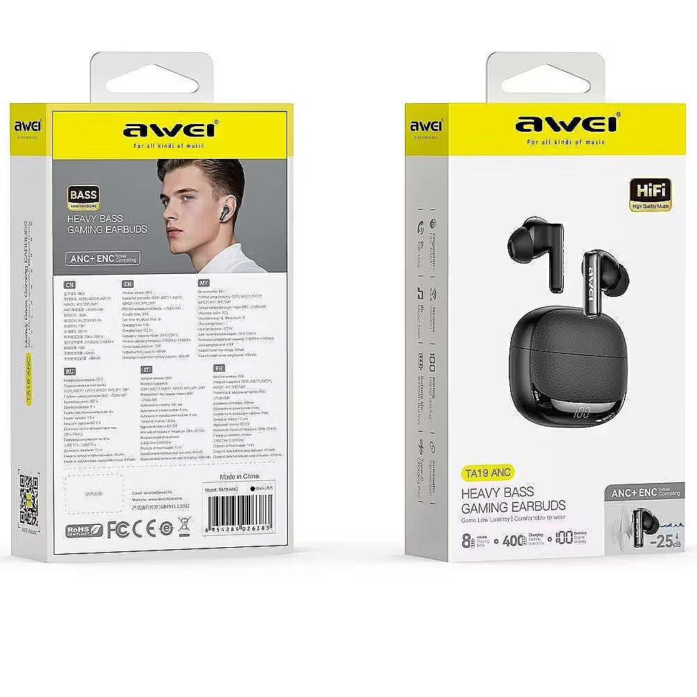 Description - AWEI TA19 ANC Bluetooth 6.0 TWS Wireless Headphones The AWEI TA19 ANC wireless headphones are an excellent choice for all music lovers who value both sound quality and comfort. Thanks to modern Bluetooth 6.0 technology, these headphones provide a stable connection and excellent audio quality, making every moment spent listening to your favorite songs a true pleasure. Modern Bluetooth 6.0 technology The AWEI TA19 ANC uses the latest Bluetooth 6.0 technology, ensuring a faster and more stable connection with mobile devices. This means you can enjoy your music without interruption, and the connection range is significantly greater than with older versions. Active Noise Cancellation (ANC) for a better audio experience The AWEI TA19 ANC headphones' active noise cancellation (ANC) feature allows for complete audio immersion by eliminating unwanted ambient noise. This allows you to fully focus on your music, podcasts, or movies, no matter where you are. Convenient docking station The headphones come with a practical docking station for easy charging and storage. This ensures the headphones are always ready for use, and charging is quick and convenient. Ergonomic design and wearing comfort The AWEI TA19 ANC headphones are designed with comfort in mind. Their lightweight construction and ergonomic shape allow them to be worn for long periods without discomfort. They fit perfectly in the ear, further enhancing listening comfort. High sound quality and strong bass These wireless TWS headphones offer excellent sound quality that will satisfy even the most discerning audiophiles. Powerful bass and clear highs make every note sound exceptional, taking music to a whole new level. High-quality materials The AWEI TA19 ANC headphones are made of high-quality plastic, ensuring durability and an aesthetically pleasing appearance. Their elegant black finish makes them not only functional but also stylish, perfectly complementing a variety of styles.