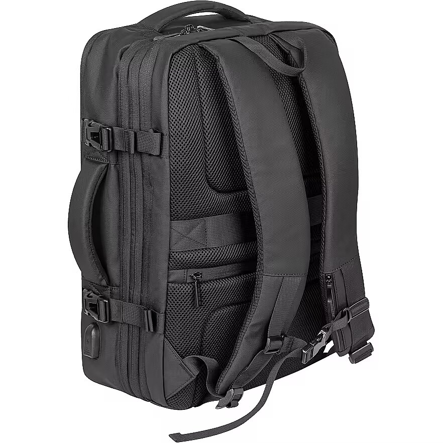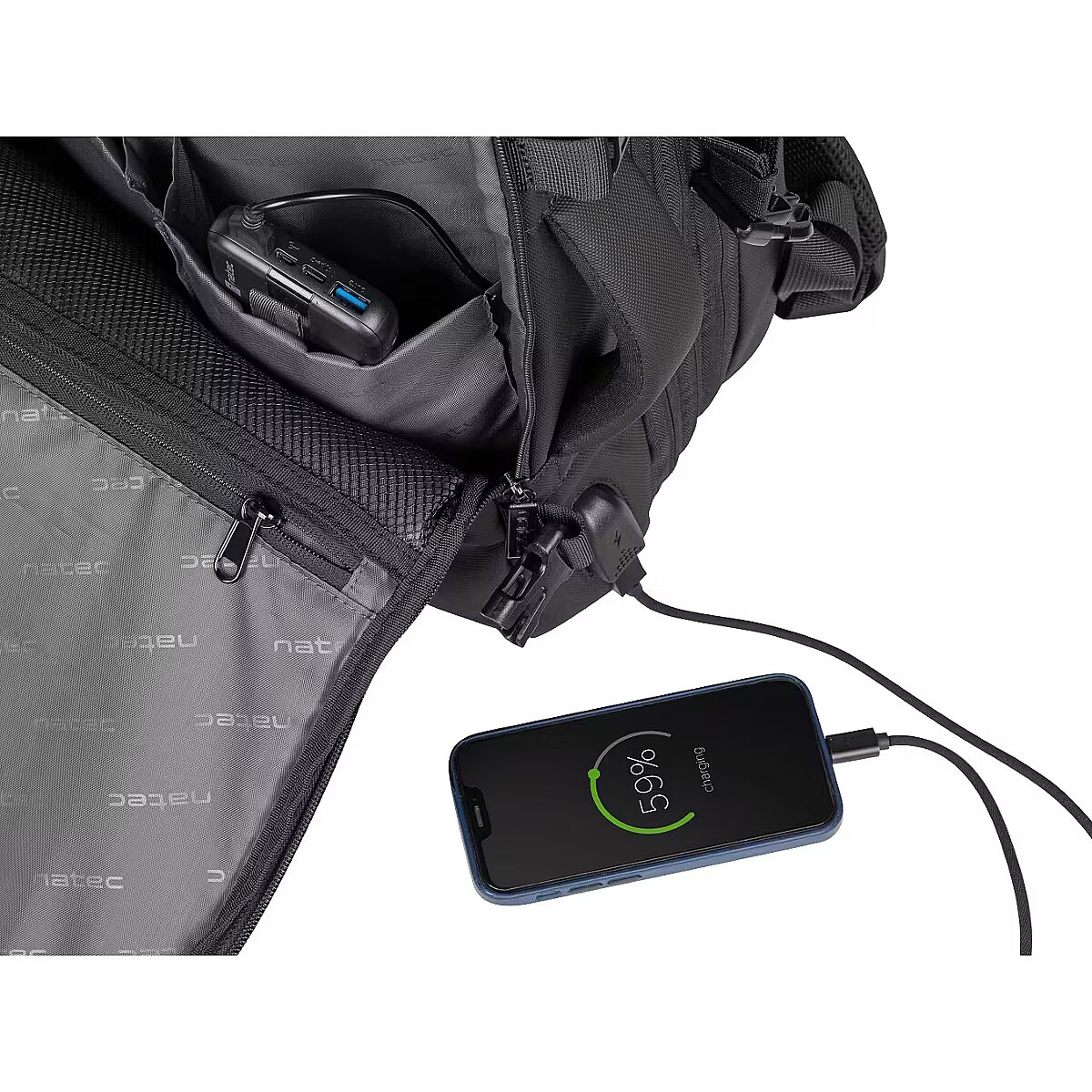Description - On the ground and in the air. Have the essentials at hand  Meet the Natec Camel Pro - a versatile 2-in-1 backpack that will work great as a city backpack, gear for a long trip and as hand luggage during a multi-hour flight. As many as 3 chambers hidden inside will allow you to carry not only a 17.3" laptop, accessories or documents, but also clothes. Bet on one backpack and forget about extra bags. This is the Natec Camel Pro.  1 backpack and up to 3 chambers  Don't want to limit yourself? With Natec Camel Pro you don't have to worry about lack of space. We equipped our backpack with as many as 3 chambers. The first one is padded with soft material, which will protect your laptop up to 17.3" and additional equipment or documents. What's more, to increase the security of the equipment you carry, you can secure it with a lock. The second is a fully expandable chamber, where you can easily fit your clothes. That's what makes the Natec Camel Pro perfect, for example, as hand luggage on a plane. The third chamber guarantees you plenty of space for free arrangement. Accessories? Wallet? Keys? The Natec Camel Pro has a place for everything.  Even more space  And that's not all. Natec Camel Pro - in addition to 3 main chambers - will give you access to 3 pockets located on the front, and even a dedicated pocket for a powerbank. A special cable slot will allow you to connect your devices to an external USB port and replenish energy whenever you want. Charging on the go? With the Natec Camel Pro, it's easier than ever.  Walk in all conditions  With the Natec Camel Pro you can wander regardless of the weather conditions. Its durability is due to its high-quality material with waterproof properties. On the way to school, on a business trip, or out on the town - no matter where you are, you can count on it.  Wear as you like  Use the soft, fully adjustable harness with chest strap or use the classic reinforced handle. This will be facilitated by the compression function of the suspenders, which will turn your Natec Camel Pro into a roomy bag. What's more. Thanks to the Trolley system, you can easily attach the backpack to the telescopic handle of your suitcase.