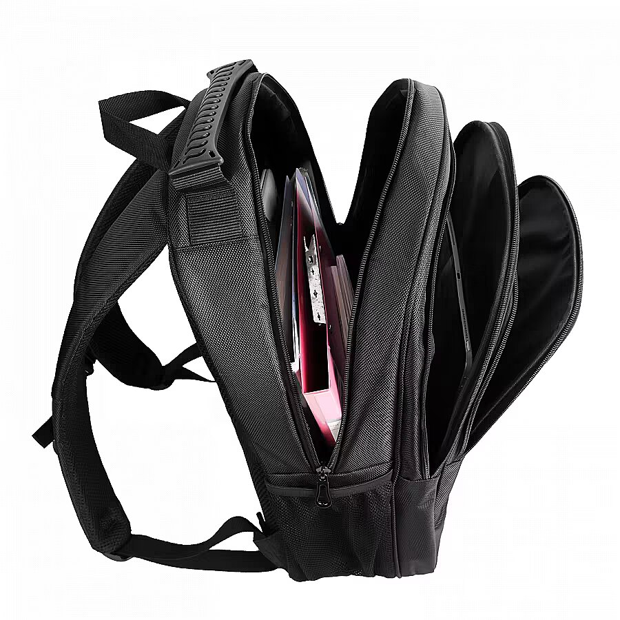 LongDesc - The 16" Professional Business Backpack is sleek, durable and made from weather-resistant material. The backpack features a well-padded laptop compartment to keep devices secure. The cushioned handle and padded back of the bag make it comfortable to carry either way. The backpack features three zippered compartments; one for books or clothing, one organizer/workstation, and the outside, quick-access compartment to grab what you need most often. The backpack also has two water bottle holders to keep your hands free while on the goProfessional Business BackpackA sleek and durable backpack made from weather-resistant material. The backpack features a well-padded laptop compartment to keep devices secure. The cushioned handle and padded back of the bag make it comfortable to carry either way.Large capacity22L capacity space with a dedicated well-padded laptop compartment pocketMultiple compartmentsEasy-access organizer compartment with plenty of room for accessories and two mesh side pocketsSecured spaceWeather-resistant, durable material, and RFID pocket protects your chip-based credit card information from skimmers