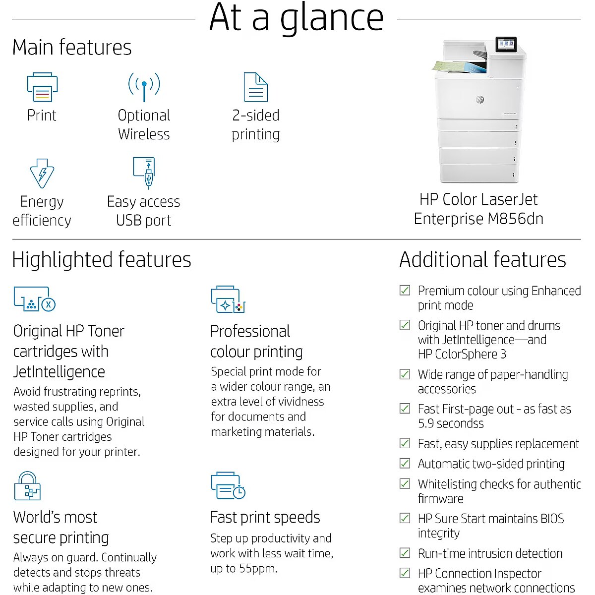 LongSummaryDescription - HP Color LaserJet Enterprise M856dn. Print technology: Laser, Colour. Number of print cartridges: 4, Maximum duty cycle: 250000 pages per month. Maximum resolution: 1200 x 1200 DPI. Maximum ISO A-series paper size: A3. Print speed (black, normal quality, A4/US Letter): 56 ppm, Duplex printing. Display: CGD. Network ready, Wi-Fi. Product colour: White