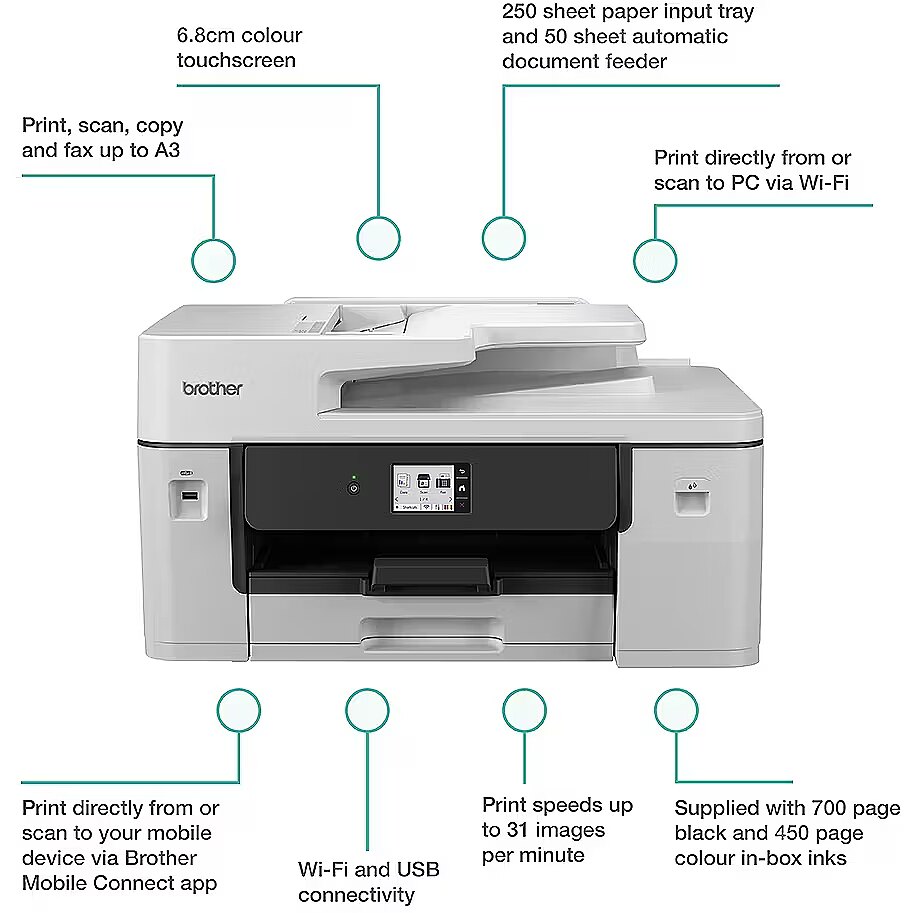 LongDesc - The MFC-J6760DW delivers premium A3 printing, scanning, copying, and faxing in one durable inkjet device. Featuring MAXIDRIVE technology, offering fast print speeds and consistently high-quality results.Reliability with MAXIDRIVEBrother's patented MAXIDRIVE print chip features advanced piezoelectric technology that ejects ink at high power allowing for faster printing with precision ink delivery. The automatic maintenance, durable components and premium pigment inks consistently produce vibrant colours and crisp, sharp text from your first page to your last.Effortless setup and useTake control with driverless printing for a quick and effortless setup. Flexible connectivity options include Gigabit Ethernet, 5GHz Wi-Fi and USB enabling fast and hassle free use.Connect for more controlSet up, print and scan on the go with the Brother Mobile Connect app. Control all your Brother printers from the palm of your hand. Easily check ink levels, order and save on genuine Brother supplies, access your scanned documents history and personalise your frequently used features.