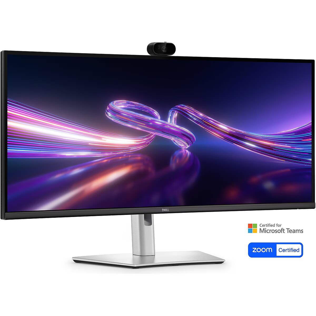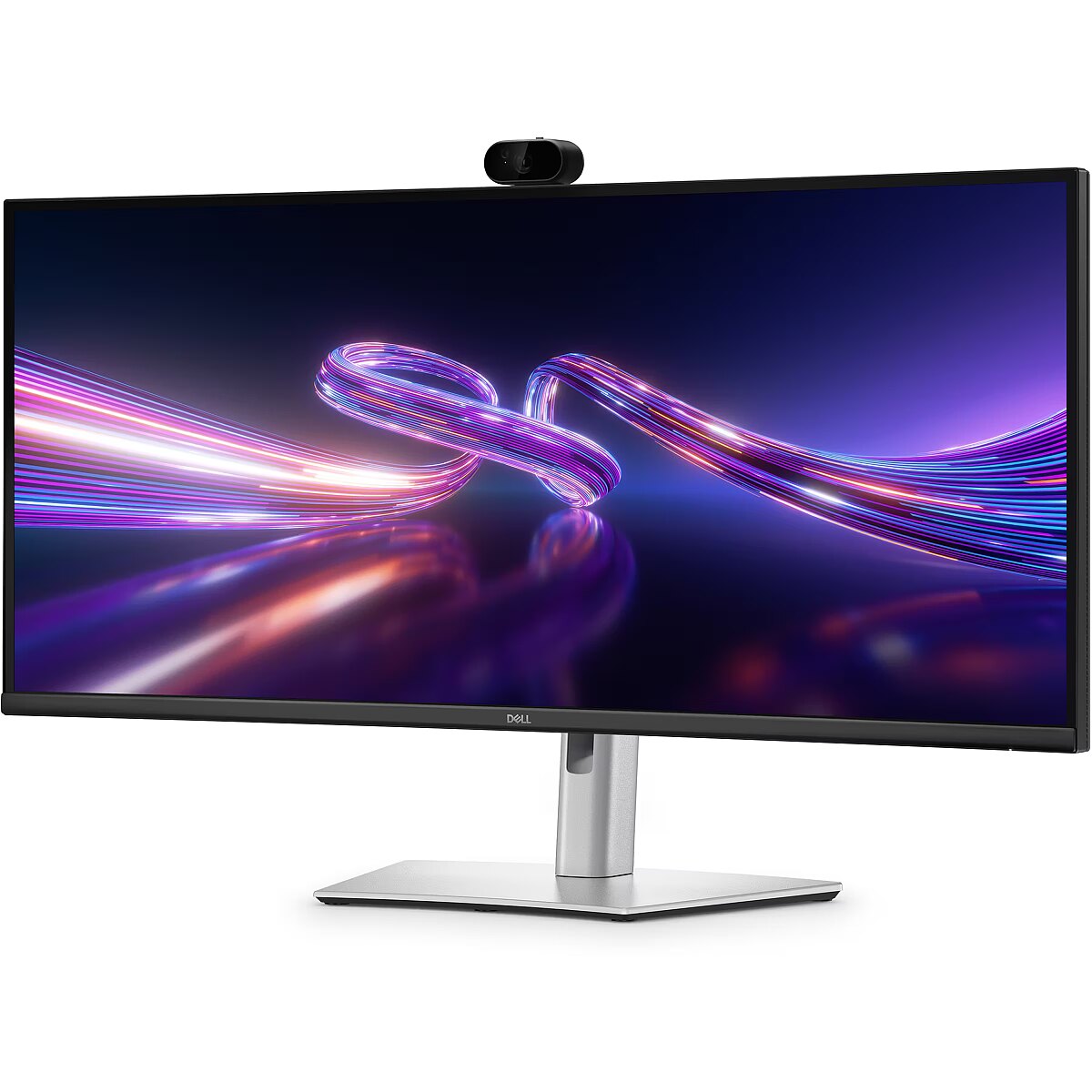 LongDesc - Elevate collaboration in open workspaces with a 34-inch WQHD IPS curved monitor featuring a built-in webcam.