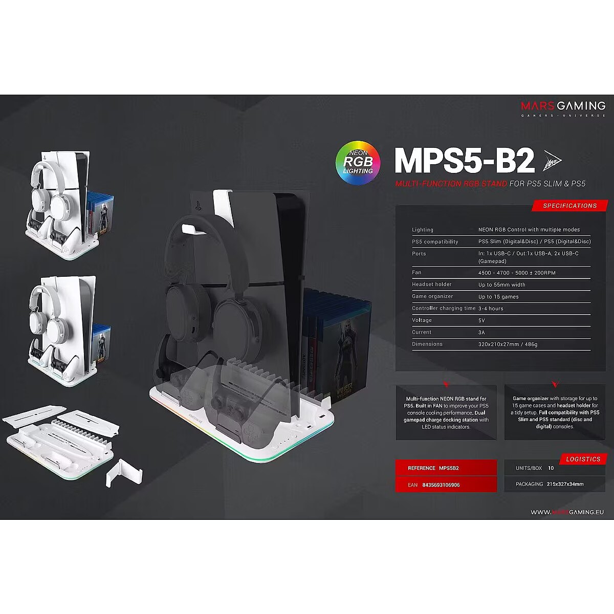description_en - The MPS5-B2 stand for PS5 is the perfect all-in-one gaming accessory. It combines efficient cooling, neon RGB lighting, controller charging, an additional USB port, a headphone stand, and game storage in one place. Compatible with PS5 Slim, Standard, and Digital Edition consoles, this stand is designed to optimize your gaming setup. Take your gaming experience to the next level with the MPS5-B2 multifunction stand!
