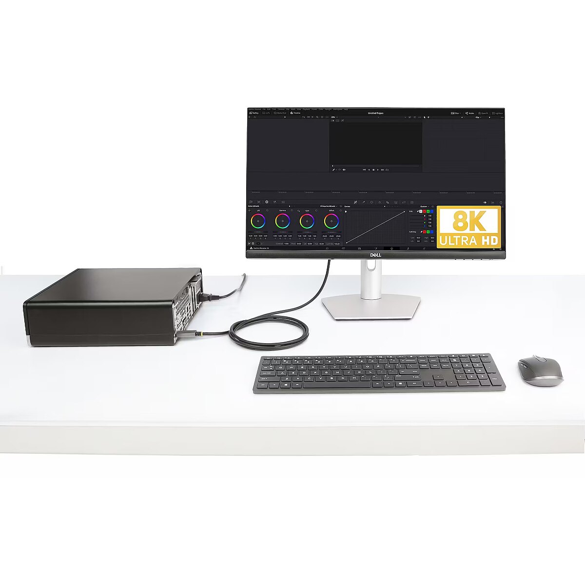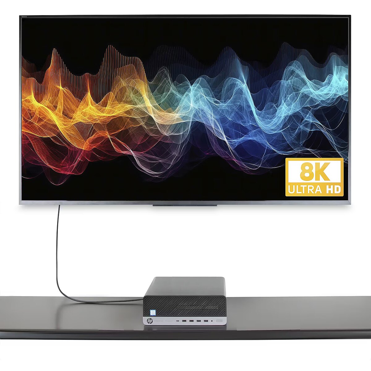 LongDesc - Connect an 8K 60Hz or a 4K 144Hz HDMI display to a DisplayPort-enabled desktop at a distance of up to 6.6ft (2m), using this DisplayPort to HDMI Adapter Cable.High-Resolution HDR VideoThis DP to HDMI Cable enables resolutions of up to 8K 60Hz and is HDMI 2.1 FRL complaint. It supports HDR10, HDCP 1.x/2.2/2.3, and DSC 1.1/1.2a. The adapter cable supports 7.1 channel audio with Dolby Atmos and DTS:X.*DSC support required to reach maximum resolution capabilities on Intel 11th Gen or laterUniversal CompatibilityThe DisplayPort to HDMI Converter Cable is compatible with desktops from various brands such as Dell, HP, Lenovo, and more. It works with all hardware platforms and any operating system. The DP to HDMI Cable requires no drivers or software and works with dedicated graphics card from Nvidia and AMD.Thoughtfully DesignedCombining a video adapter and cable minimizes potential points of failure and signal loss. Adaptive receiver equalization optimizes the input signal and amplifies the output signal to ensure compatibility with high-resolution monitors. The cable is equipped with cage shielding to prevent Electromagnetic Interference (EMI).