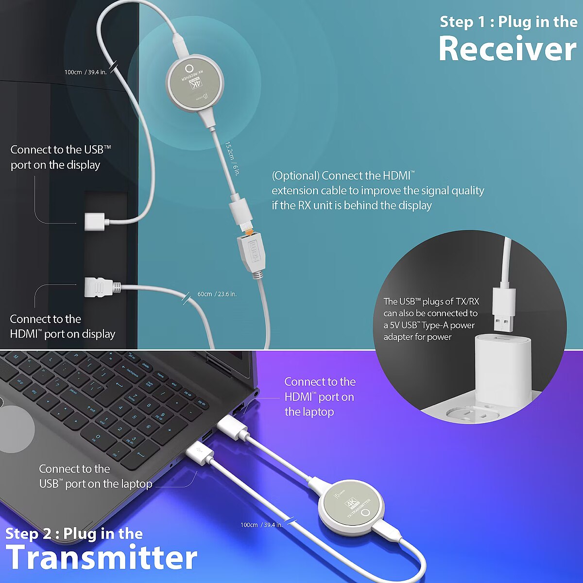 LongDesc - The JVAW75 4K Wireless Display HDMI™ Extender comes with both a transmitter and receiver kit. With a receiver distance of up to 98.4 feet (30m) and minimal latency, it can deliver a 4K video and audio signal to an HDMI™ capable TV set, projector, or monitor. Other HDMI™ sources, such as DVD players, Blu-ray™ players, PCs, notebooks and game consoles (ex. Sony® PlayStation™ 4 / 5, Nintendo Switch™) can be extended. The JVAW75 supports resolutions up to 4K and stereo digital audio through HDMI™ and is completely HDCP compliant so o you can watch your favorite streaming services.