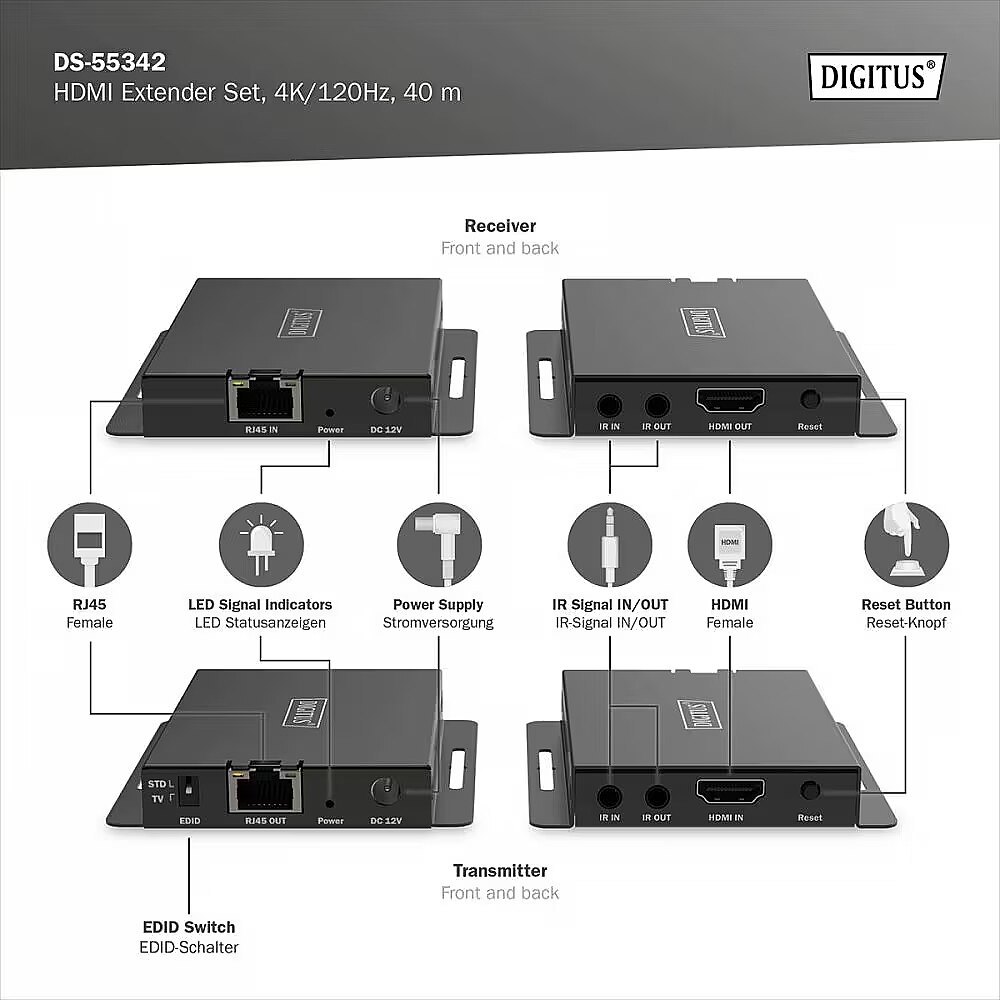 Description - The DIGITUS HDMI Extender Kit enables HDMI signal transmission up to 40m (4K/120 Hz, 4:4:4) using CAT 6 or higher cables. Its functionality also includes bi-directional infrared (IR) signal transmission, allowing flexible control of the signal source. It is also suitable for wall mounting, offering flexible installation options. HDMI signal transmission (point-to-point) up to 40 m in UHD resolution (4K/120 Hz, 4:4:4) Bidirectional infrared signal transmission Supports CAT 6, CAT 6A, and CAT 7 network cables Max. resolution: 4K/120 Hz (4:4:4) Video bandwidth: 32 Gbps Suitable for wall mounting Transmitter module connectors: 1 x HDMI input (4K/120 Hz) - for connecting a signal source 1 x RJ45 output for connecting a CAT cable for transmission 1 x IR output for connecting an IR transmitter 1 x IR input - for connecting an IR receiver 1 x power supply input (DC 12 V/1 A) - for connecting an external power supply 1 x resolution switch (4K/120 Hz, EDID pass-through) 1 x reset button 1 x status LED Receiver module connectors: 1 x HDMI output (4K/120Hz) - for connecting a display 1 x RJ45 input - for connecting a CAT cable 1 x infrared output - for connecting an infrared transmitter 1 x infrared input - for connecting an infrared receiver 1 x power supply input (DC 12V/1A) - for connecting an external power supply 1 x reset button 1 x status LED