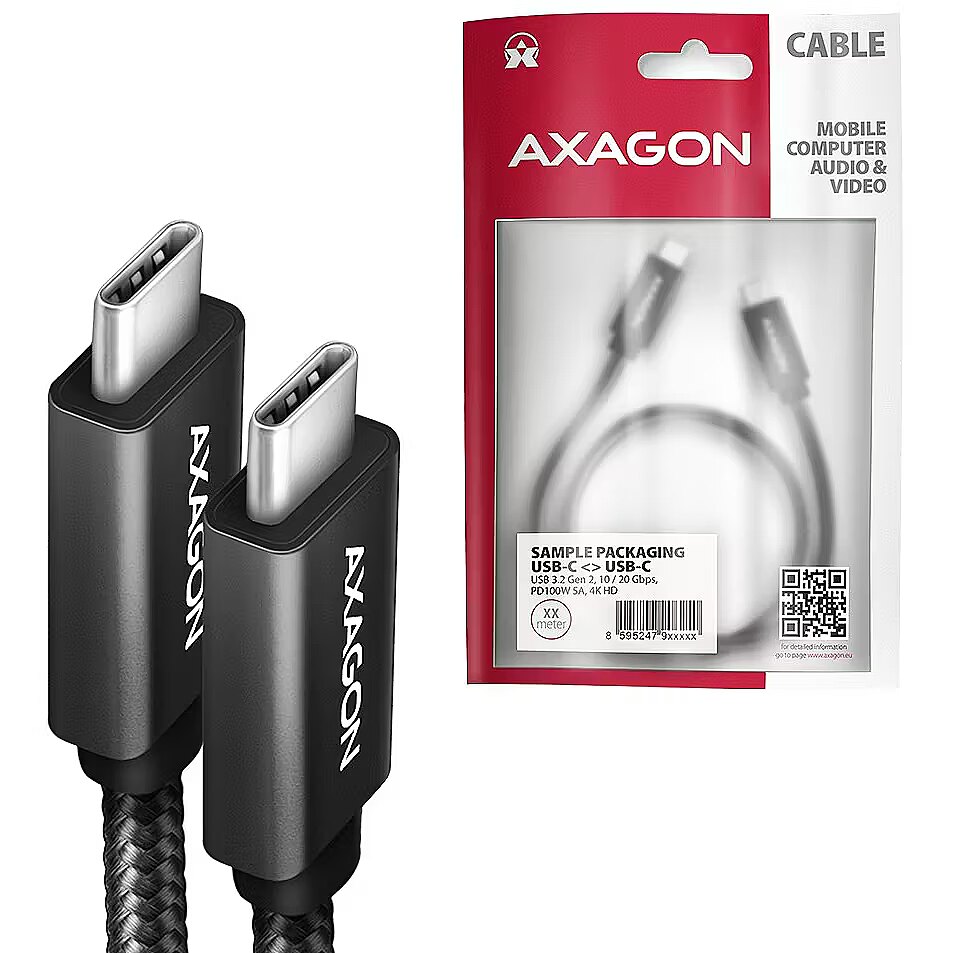 LongDesc - Premium connection USB-C USB-C data and charging AXAGON BUCM32-CM05AB SPEED+ USB 20Gbps (3.2 Gen 2x2) cable with USB-C male connectors at both ends. The cable is designed for very fast data transfers, video transfer and charging laptops, phones, tablets and other mobile devices with up to 100W of power. It also allows you to connect monitors, docking stations and external SSDs.The cable is designed to transfer data at a maximum speed of up to 20 Gb/s and can easily handle 10 Gb/s (USB 3.2 Gen 2). It also supports up to 4K/60Hz Ultra HD video and audio transmission. This makes the cable an ideal accessory for the iPhone 15 Pro and Pro Max (or later), which allow data transfer speeds of up to 10 Gb/s. Its compatibility with MacBooks and other storage devices, such as NVMe M.2 external drives, ensures your data transfer will be 10x faster than with a standard cable or AirDrop wireless connection. Thanks to the integrated E-Mark chip, the cable can charge connected devices with a current of 5A up to 100W. It is compatible with Power Delivery 3.0, Quick Charge 4+ or Quick Charge 3.0 charging technologies for very fast charging not only smartphones and tablets, but also laptops. Compatibility is also ensured with other fast phone charging standards such as Apple iPhone, iPad, Samsung. The main advantage of the power cable is the Power Delivery 3.0 standard for charging Apple MacBook, Lenovo, Asus, HP, Dell and other laptops. You can charge your laptop directly from a USB-C charger or with the increasingly popular docking stations and port replicators. Cable conductors are made of Tin-plated oxygen free copper. Power cables 22AWG (lower number = larger cross-section and lower wire resistance) and 32AWG data wires guarantee fast charging and reliable data transfer of connected devices. High-quality cable insulation, made of flexible TPE, guarantees maximum durability and also maintains sufficient flexibility. Triple shielding protects transmitted signals from adverse interference. The cable is equipped with aluminum end caps, connectors with nickel-plated surface and gold-plated contacts. The final strength of the cable is provided by the nylon braid. The braid in combination with a cable gland significantly reduces dangerous cable bending. The cable life is extended to more than 8000 standard bends. The bonus is the included practical strip for easy packing of the cable.Connectors:• 2x USB-C (M) male.Data transmission:• USB 20Gbps (USB 3.2 Gen 2x2), also compatible with USB 10Gbps (USB 3.2 Gen 2).• Support for second-generation data rates of 20.000 / 10.000 Mb/s.• Backward compatible with USB 5Gbps (USB 3.2 Gen 1 / USB 3.1 Gen 1 / USB 3.0) / USB 2.0 (USB 480Mbps).• Supported transmission rates 5.000 / 480 Mb/s.Video transmission:• 4K resolution 4096 x 2160 at up to 60Hz, 2K/WQHD resolution 2560 x 1440 at up to 120Hz, FHD resolution 1920 x 1080 at up to 240Hz.• HDR support (High dynamic range, 10-bit support) - realistic reproduction of light and dark details.• Audio transmission support - depends on the source and destination device, i.e. laptop/phone and TV/monitor/AV receiver.Supported charging technologies (up to 100W):• SMART / Apple 2.4A (iPad).• AFC / SFC / SFC 2.0: Samsung Charging.• QC 2.0 / QC 3.0 / QC4+: Qualcomm Quick Charge.• PPS (part of USB PD 3.0 and QC4+).• PD 2.0 / PD 3.0: USB Power Delivery - 100W (20V/5A).• Support for fast charging with a current of up to 5A.• Integrated E-MARK Chip.Other features: • Cable includes power wires 22AWG, data wires 32AWG. • Tin-plated oxygen free copper conductors to reduce oxidation, increase conductivity, and clear signal without distortion.• Double shielding with plated foil and tinned copper braid minimizes interference and prevents signal loss.• Nickel-plated connectors and gold-plated contacts prevent oxidation and provide a reliable connection. • Cable length 0.5 m.• outer diameter of the cable 5.0 mm.Package contains:• USB-C M USB-C M black cable,• tightening strip,• packed in a printed and sealed foil package with hanging hole.