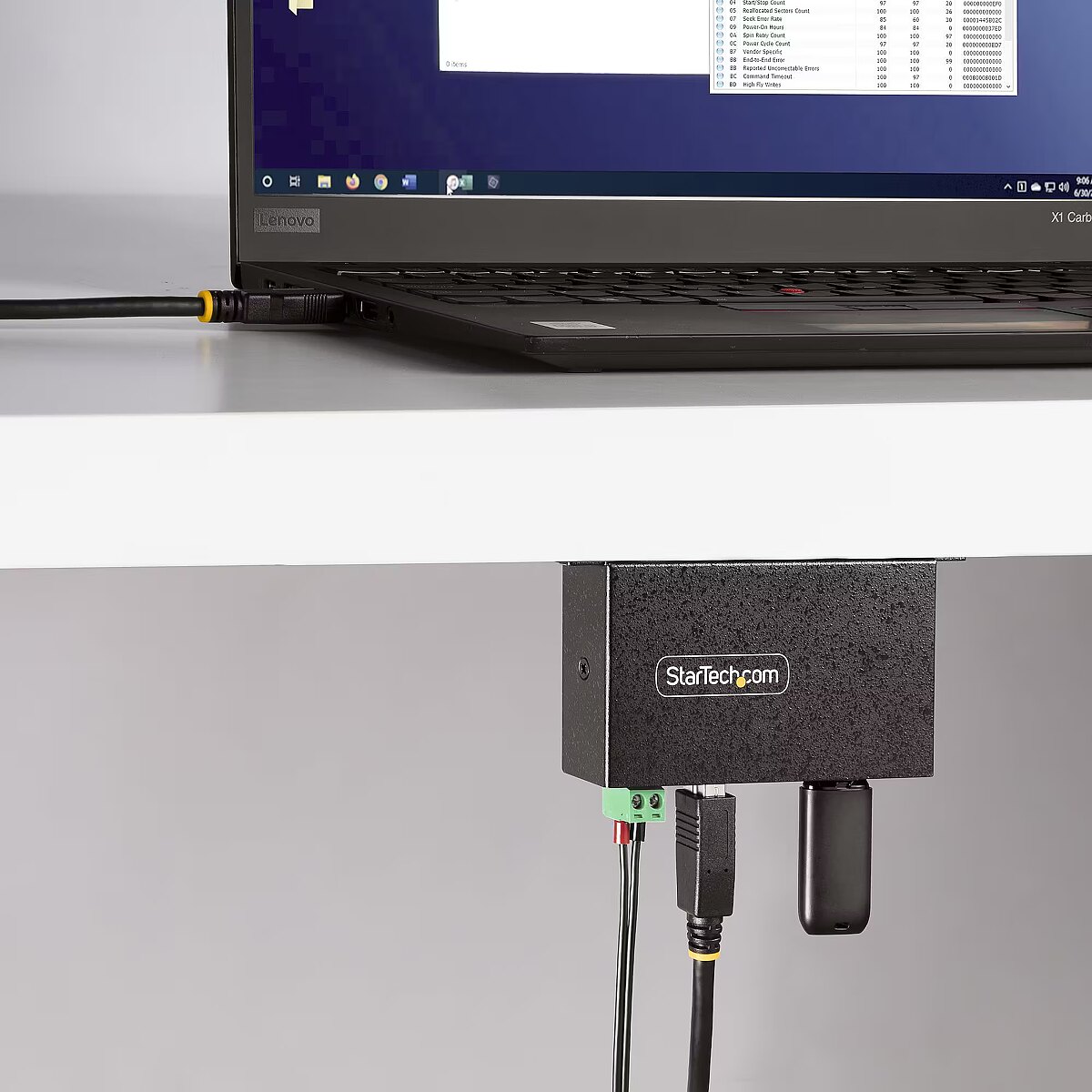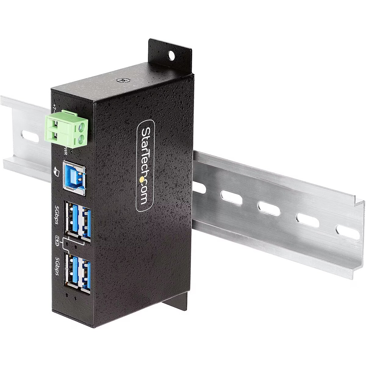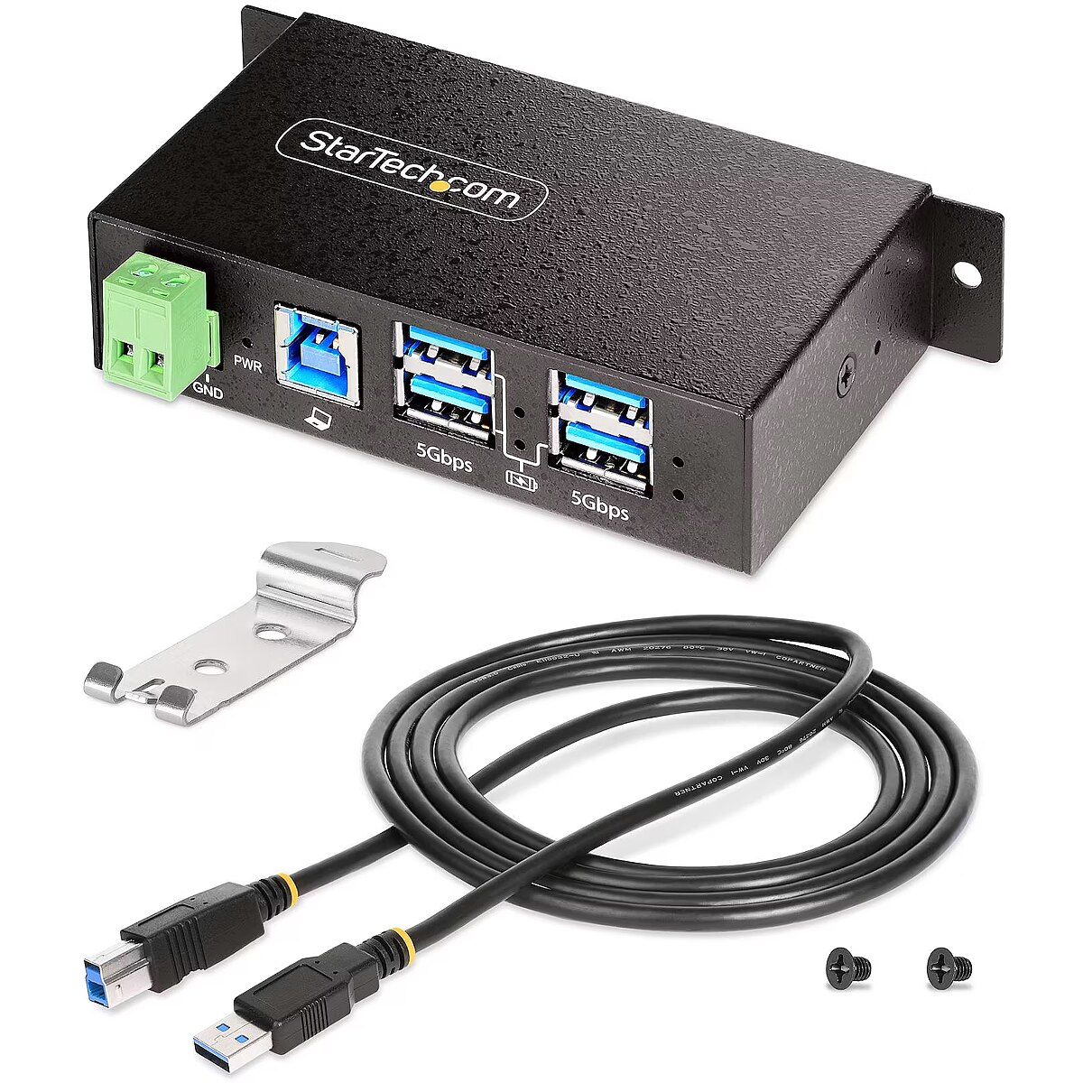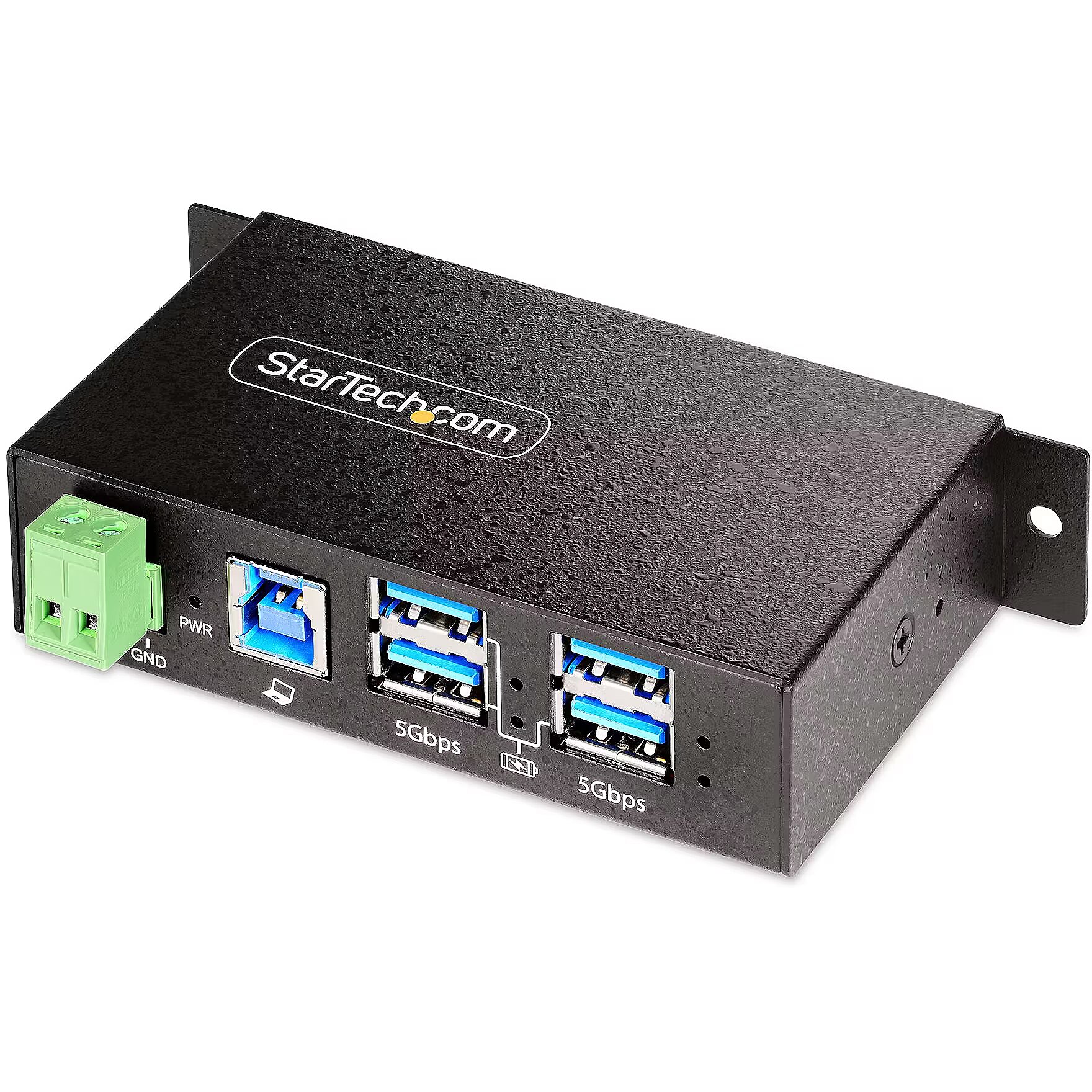 LongDesc - Connect and manage up to four USB Type-A devices, using this USB hub - designed for industrial/commercial environmentsThis 4-port Managed Industrial USB 3.2 Gen 1 (5Gbps) Hub enables users to toggle individual USB ports on/off and to reboot the hub, using the USB Hub Administrator Software (free to download). With robust housing and versatile power input options, the USB Hub is designed to cater to the needs of IT Professionals working in industrial settings such as factories, warehouses, offices, and other similar environments.Managed USB HubThe USB Hub Administrator Software is to be installed on the host computer, enabling users to remotely control device access and manage operational features. With this software, users can:• Enable or disable individual or all ports on the USB Hub.• Reboot the USB Hub.• Set a password to restrict unauthorized access.• Save port states for quick setup in specific applications.• Utilize Command Line Interface (CLI) commands for command-line operation or custom application development.The software is compatible with Windows, macOS, and Linux, making it versatile across various platforms. It supports an unlimited number of Managed USB Hubs, allowing users to connect multiple Hubs to a single host computer or cascade them in sequence.Rugged and ReliableThe Industrial USB Hub features a rugged heavy-duty metal enclosure designed to shield the hub from potential damage caused by accidental drops or sudden impacts. Moreover, it protects against Electrostatic Discharge (ESD) with 15kV air and 8kV contact Level-4 ESD protection. This robust construction ensures resiliency in demanding industrial environments, providing peace of mind for users in situations where durability and reliability are paramount.Power FlexibilityThe USB Hub offers power flexibility to cater to diverse user needs. It features a terminal block power input that supports a wide voltage range from +7 to 48 volts DC, ensuring compatibility with various power sources. With an external power source connected, the USB Hub supports USB battery charging specification 1.2, delivering up to 1.5A (7.5W) on 3 of the downstream ports, so you can power and quickly charge external devices.For optimal performance an external power source is required. StarTech.com offers an external power adapter (Part Number: ITB20D3250, sold separately) that will enable the USB Hub to operate at maximum performance.Mounting OptionsThe USB Hub is thoughtfully designed for user convenience and adaptability. Equipped with built-in mounting brackets, installation is simplified. The hub may be mounted to a variety of surfaces such as walls or desks. The DIN rail bracket ensures secure mounting in industrial environments.High-PerformanceThe rugged USB Hub supports SuperSpeed USB 3.2 Gen 1 (5Gbps) and maintains backward compatibility with legacy peripheral devices. Additionally, the USB Hub offers enhanced security through the USB Event Monitor utility, a feature within the StarTech.com Connectivity Tools application. This utility logs and timestamps USB port usage, empowering IT administrators to identify potentially malicious devices. For more details and to download the StarTech.com Connectivity Tools application, please visit: www.StarTech.com/Connectivity-ToolsThe StarTech.com Advantage
