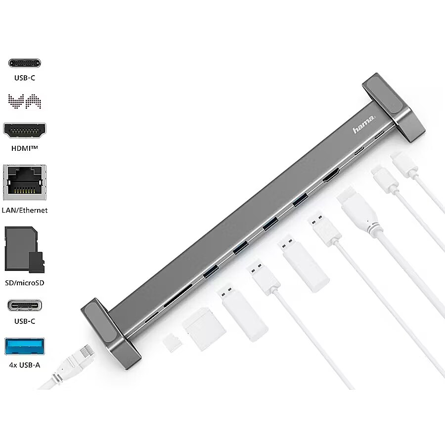 Description - USB-C docking station that allows you to connect up to 9 devices to your computer. All devices at hand With the Hama USB-C multiport, you can easily connect your laptop to multiple office devices. All ports are available in one place, eliminating the need for additional hubs. 9in1 available sockets: USB-A: e.g. for external hard drive, USB stick, mouse, keyboard, printer USB-C: e.g. for PD charger, PD power supply HDMI: e.g. for connecting a monitor, TV or projector LAN/Ethernet: e.g. for cable Internet/network connections SD/microSD card reader: e.g. for SD, SDHC, SDXC and microSD, microSDHC, microSDXC cards Smart charging Thanks to Power Delivery (PD) technology, the USB-C power supply adapts the power to the needs of the connected equipment, ensuring fast and effective charging. Data transfer at express pace The hub has four USB-A ports supporting USB 3.2 Gen 1, which guarantees ultra-fast data transfer speeds of up to 5 Gb/s, which is as much as ten times faster than the USB 2.0 standard. Foldable design If needed, the legs of the Hama Docking Station are removable, allowing you to easily pack the adapter into a bag or backpack. Technological compatibility To use the charging function, compatibility with Power Delivery (PD) or Thunderbolt 3/4 technology is required. However, the use of DP or HDMI ports requires the device to be compatible with DisplayPort mode or Thunderbolt 3/4 technology. The package includes: a USB-C docking station, 2 stand legs and a USB-C cable.