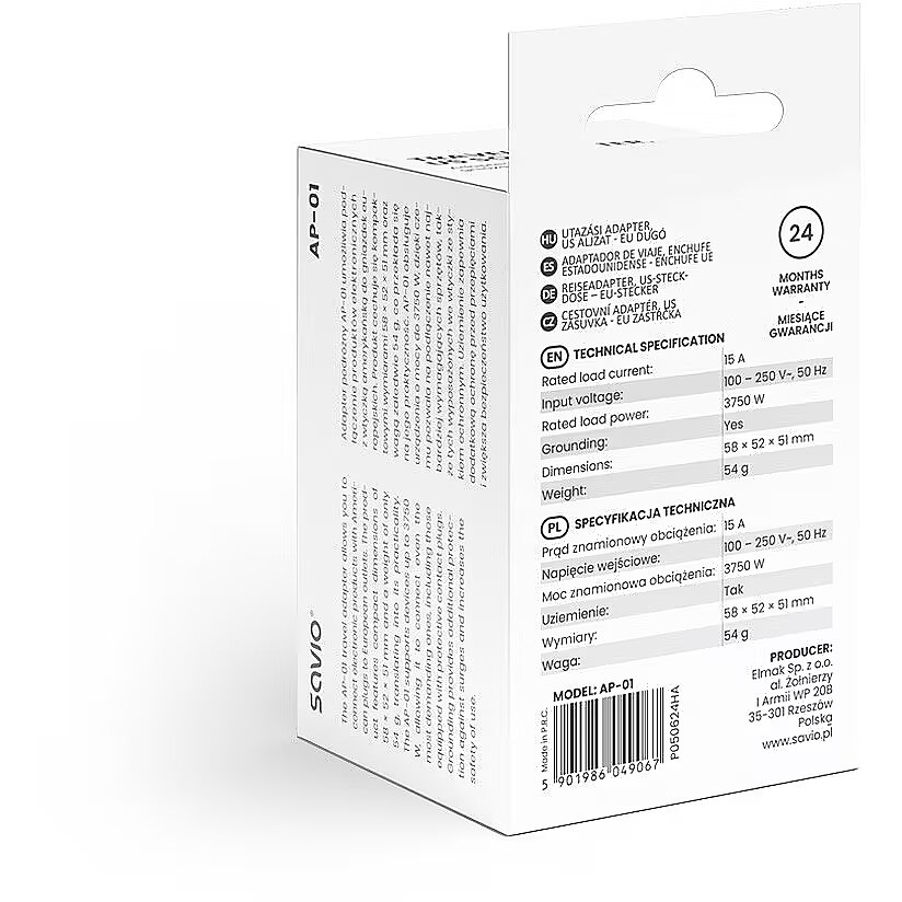 Accessories included - SAVIO AP-01 Travel adapter, US socket EU plug User manual
