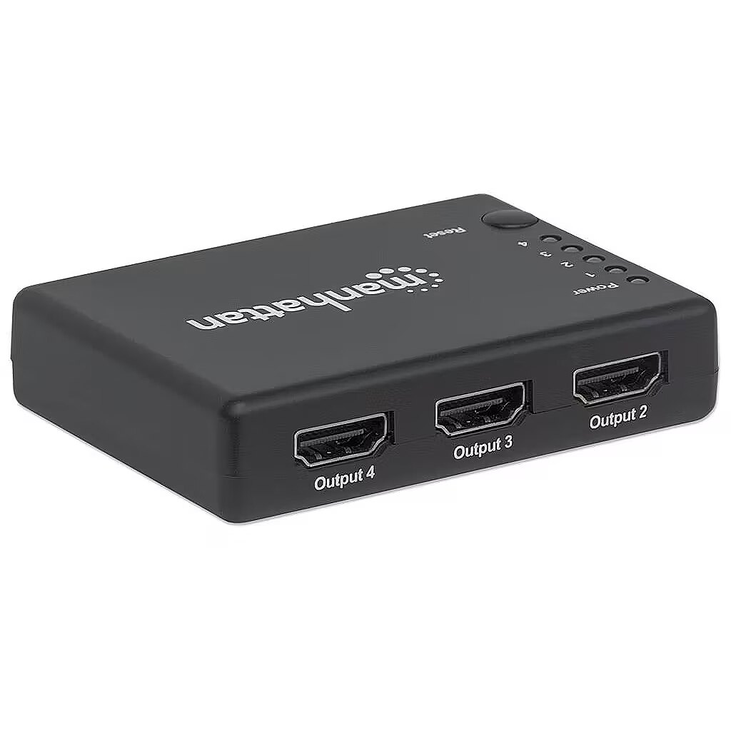 Title - Manhattan HDMI Splitter 4-Port (Compact), 4K@30Hz, Displays output from x1 HDMI source to x4 HD displays (same output to four displays), AC Powered (cable 0.7m), Black, Three Year Warranty