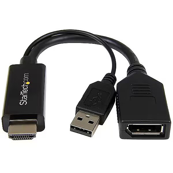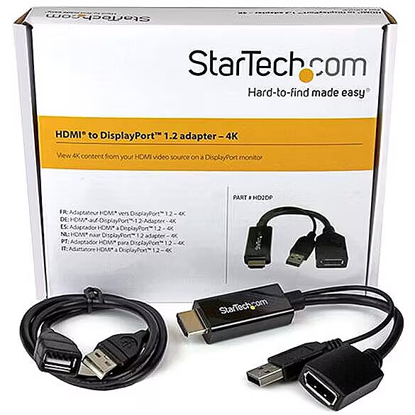 LongDesc - Connect your HDMI enabled Ultrabook or laptop to a DP monitor using this compact, USB-powered adapterThis HDMI to DisplayPort adapter lets you connect an HDMI video source, such as your laptop, desktop, Blu-ray player, or camera, to a DisplayPort monitor or projector.Be more productiveThe active HDMI to DisplayPort adapter offers plug-and-play installation, providing a hassle-free setup with no software or drivers to install. The adapter uses a USB port for power, avoiding the need for an extra power adapter. It also features a compact design that requires very little space at your workstation.The HDMI to DP adapter lets you add a second monitor to your laptop, providing the additional screen space you need to multitask more efficiently and accomplish more in the same amount of time. It offers a definite productivity boost, and lets you view documents, spreadsheets, and web pages across multiple screens.Enjoy Ultra HD picture qualityWith support for 4K at 30Hz, you get a sharp, crisp picture that’s richer and more true-to-life than traditional HD, with far greater detail. The adapter delivers Ultra HD content to your DisplayPort monitor and supports 7.1 channel surround audio.The adapter is backward compatible with 1080p displays, which makes it a great accessory for home, office or other workspace applications.The HD2DP is backed by a StarTech.com 2-year warranty and free lifetime technical support.The StarTech.com Advantage- Provides a compact solution with a plug-and-play installation- Increase your productivity by connecting a second monitor to your laptop- Deliver astonishing picture quality with support for video resolutions up to Ultra HD 4K