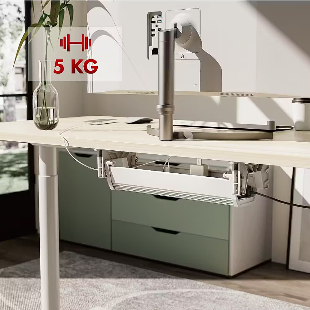 Description - Under-desk cable organizer, MC-106W Maclean MC-106 under-desk cable organizer is a practical solution to keep your workspace tidy. Made of durable plastic, it is ideal for offices, home offices and coworking spaces. Thanks to its well-thought-out design, it allows convenient routing of power, network and other cables, eliminating the problem of tangles under the desk. The organizer can be mounted at two different heights, allowing you to adjust it to your individual needs. An additional advantage of the organizer is the easy opening system, which facilitates quick access to cables without the need to remove the entire element. The sturdy design provides a maximum load of up to 5 kg, making it also suitable for heavier power supplies or power strips. Aesthetically pleasing, neutral design makes the MC-106 organizer fit discreetly into most desks, without disturbing their appearance. It is an ideal solution for those who value order, functionality and aesthetics in the workplace.