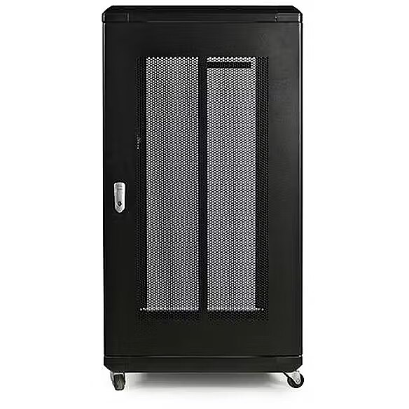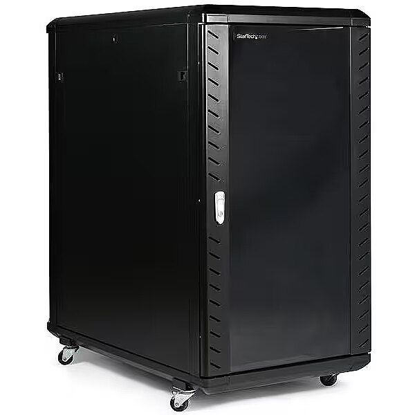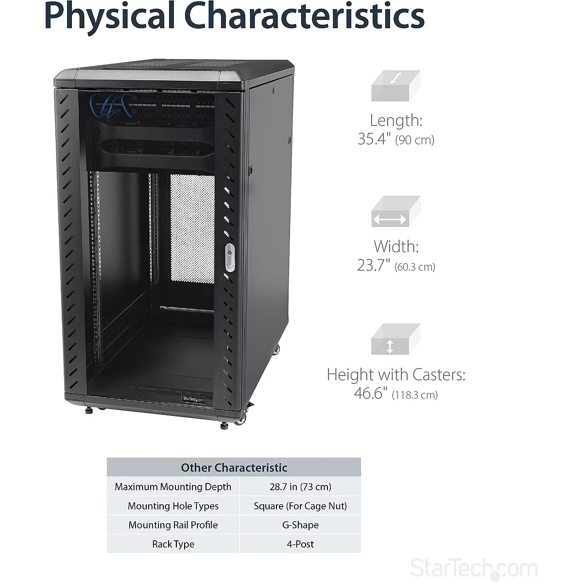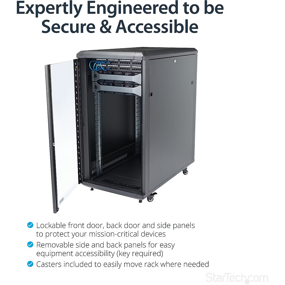 ShortSummaryDescription - StarTech.com 4-Post 22U Server Rack Cabinet, Lockable 19" Data Rack Cabinet for Computer / AV / IT Equipment, Office / Home Network Rack with Casters & Adjustable Mounting Rails, Freestanding rack, 22U, 800 kg, Key lock, Castor wheels, 62.6 kg