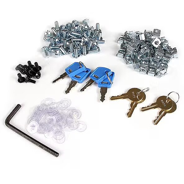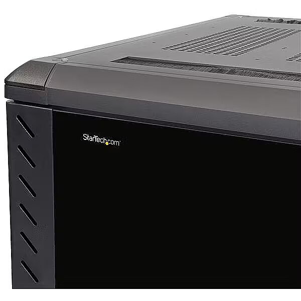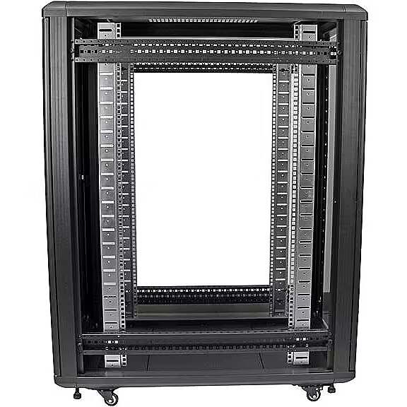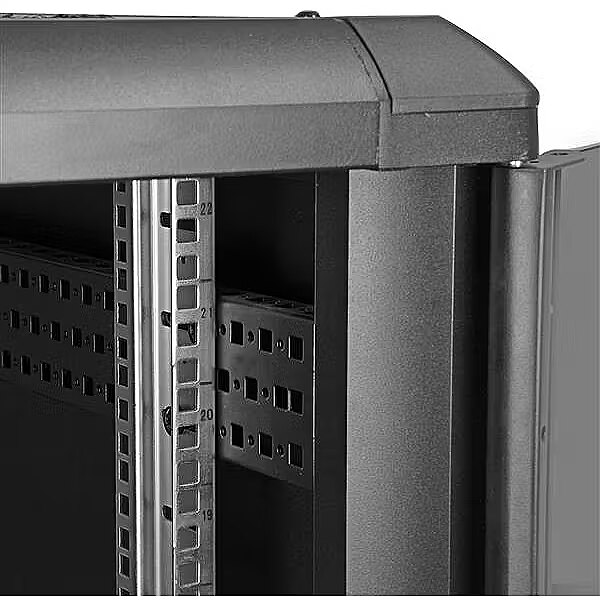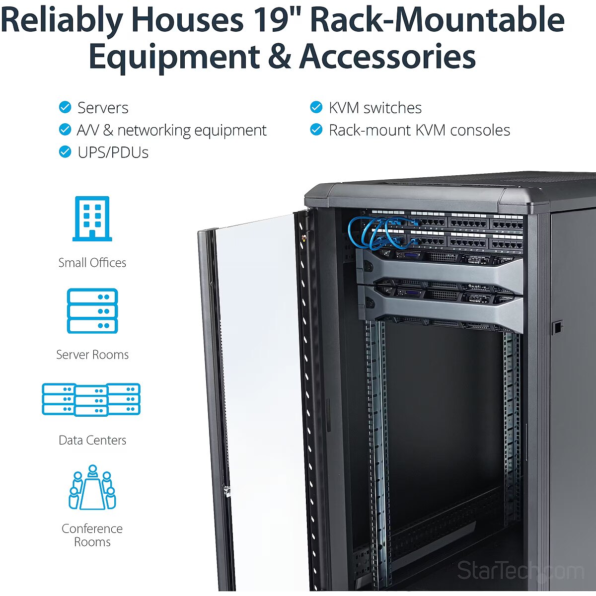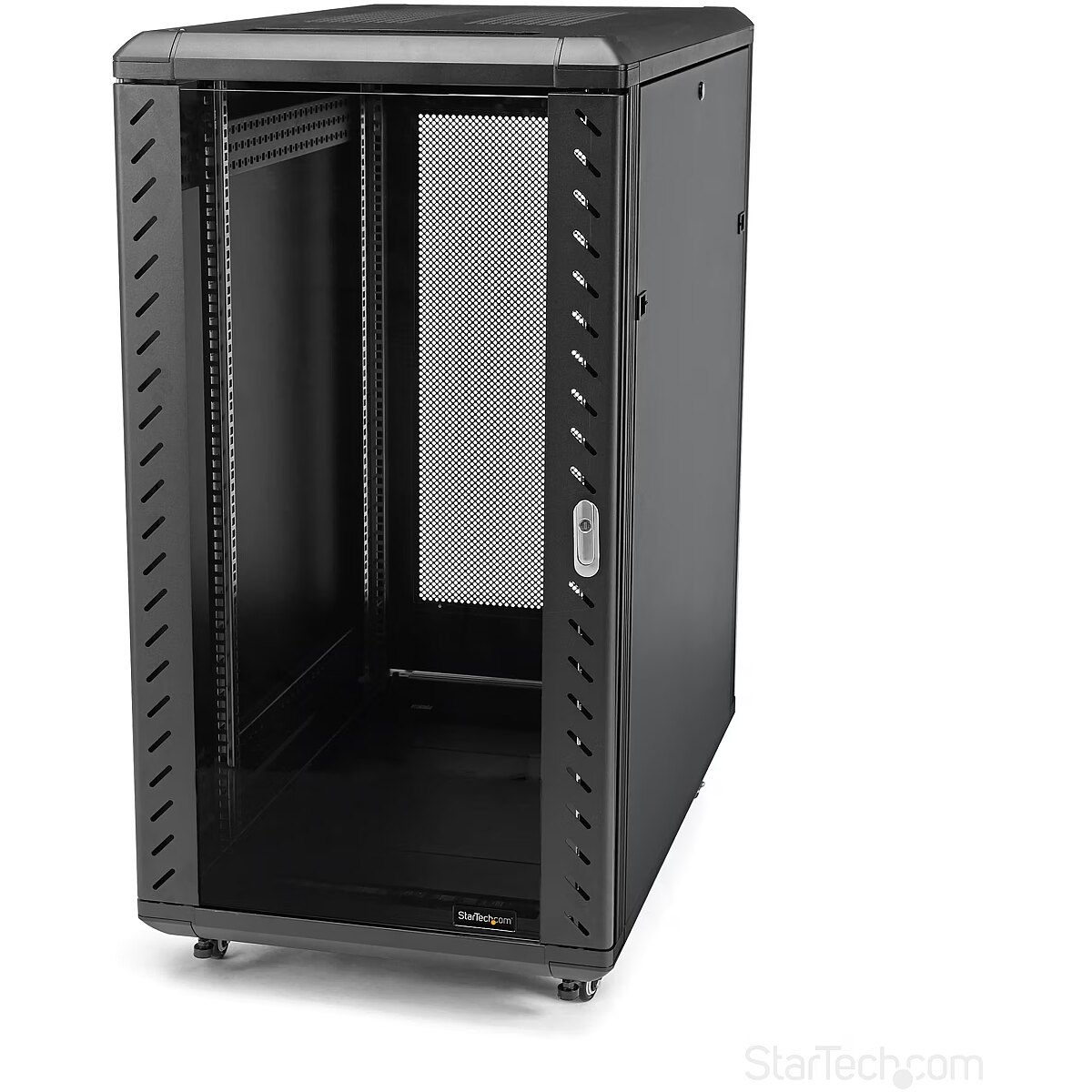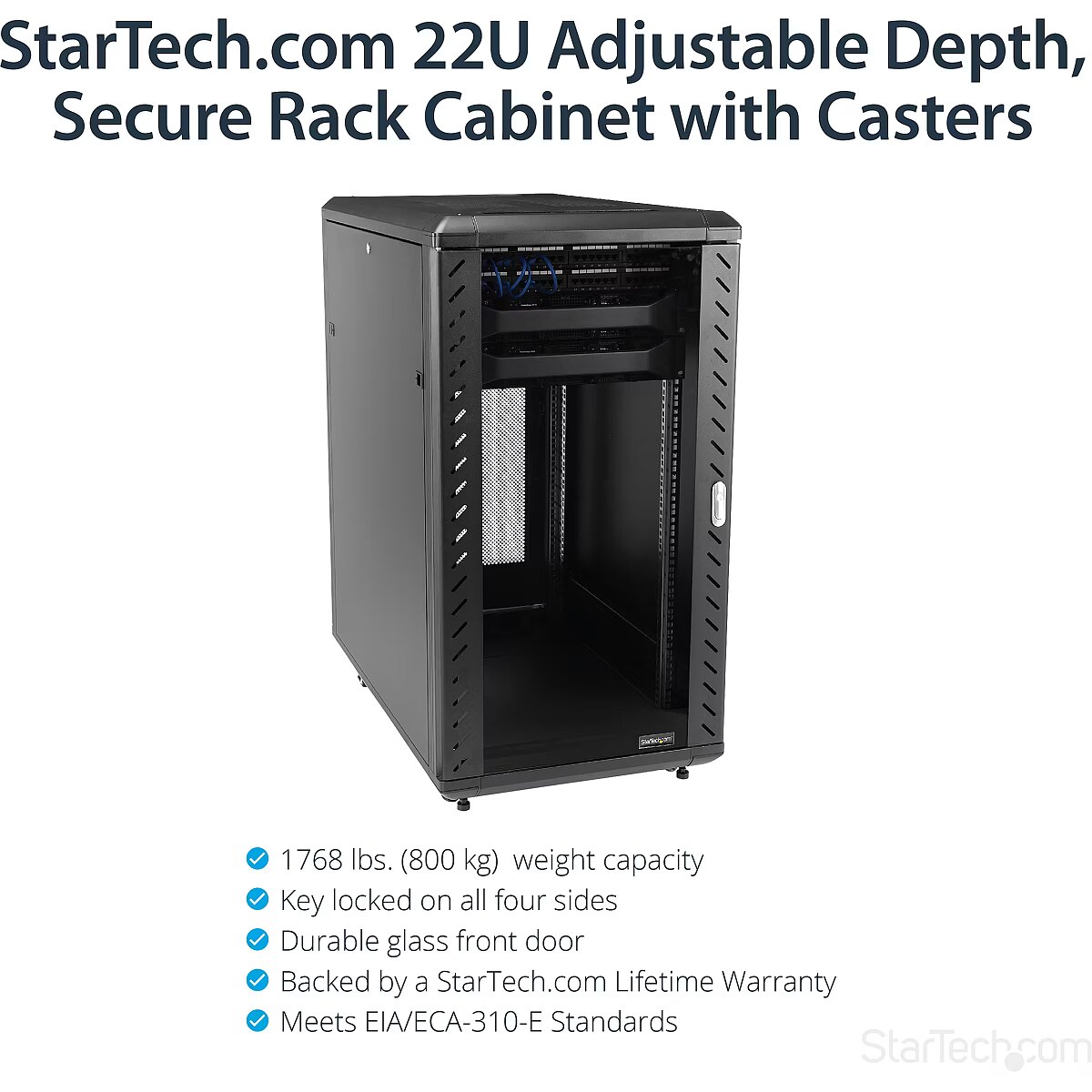 LongDesc - Securely store servers, network and telecommunications equipment in this 22U server rackThis server rack provides 22U of storage space in a sleek secure cabinet for storing EIA-310 compliant 19" rackmount devices such as Dell, HP and IBM servers along with telecommunication and A/V equipment. The rack creates a robust storage solution supporting a total load capacity of 800 kg. (1763.7 lbs.).Hassle-free equipment installationThis rack has been engineered with different features that enable you to easily incorporate plenty of equipment.With adjustable mounting rails you can easily change the rail depth to up to 32.7 in. (830 mm). These rails ensure the cabinet is widely compatible with your standard rackmountable equipment. The added depth also provides support for additional cable and power management behind your equipment.The rack features brushed ports on the ceiling and floor panels that enable you to easily run cabling to the inside and outside of the cabinet, for discreet cable management. The floor and ceiling panels can also be removed enabling you to customize your setup, and the rack features grounding lugs that enable you to ground your equipment for added protection.Securely protect your equipment while still being able to see itTo ensure you have full visibility of your equipment while securely locking it up, this rack has a stylish glass window on the front door. The glass door looks great in any server room, and gives you the freedom to clearly monitor equipment without the hassle of opening your rack.The rack also has removable side panels with independent locks quick-release mechanisms that enable you to easily access your equipment while still keeping it secure.Save money, with a cost effective, compact shipping containerThe cabinet comes in a flat packed box to reduce shipping volume, which significantly reduces your costs in shipping. Plus, because the rack is packaged efficiently, you can easily store the cabinet, for deployment at a later date.Maximum Maneuverability, with casters includedThe cabinet features casters ensuring hassle-free access to the rear mounted equipment, while providing ease of mobility around your office, studio or server room. Plus, the width and height of the rack fits through standard doorways, giving you the freedom to wheel your server rack into different rooms.Ensure your equipment is running at an optimal temperatureThe rear door on the rack is mesh, and the front glass door is vented, working together to increase airflow to provide passive cooling that's cost effective and ensures your equipment runs at an optimal temperature.The top ceiling panel features square venting holes that are cage nut compatible, which provide mounting points that enable you to add additional equipment at the top of your rack.The RK2236BKF is backed by a lifetime StarTech.com warranty with free technical support.The StarTech.com Advantage