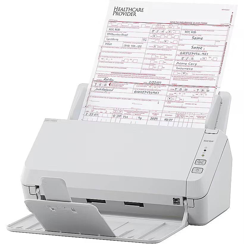 LongSummaryDescription - Ricoh SP-1125N. Maximum scan size: 210 x 297 mm, Optical scanning resolution: 600 x 600 DPI, Output colour depth: 24 bit. Scanner type: ADF scanner, Product colour: Grey. Sensor type: CMOS dual CIS, Light source: RGB LED, Scan file formats: PDF. Maximum ISO A-series paper size: A4. USB version: 3.2 Gen 1 (3.1 Gen 1)