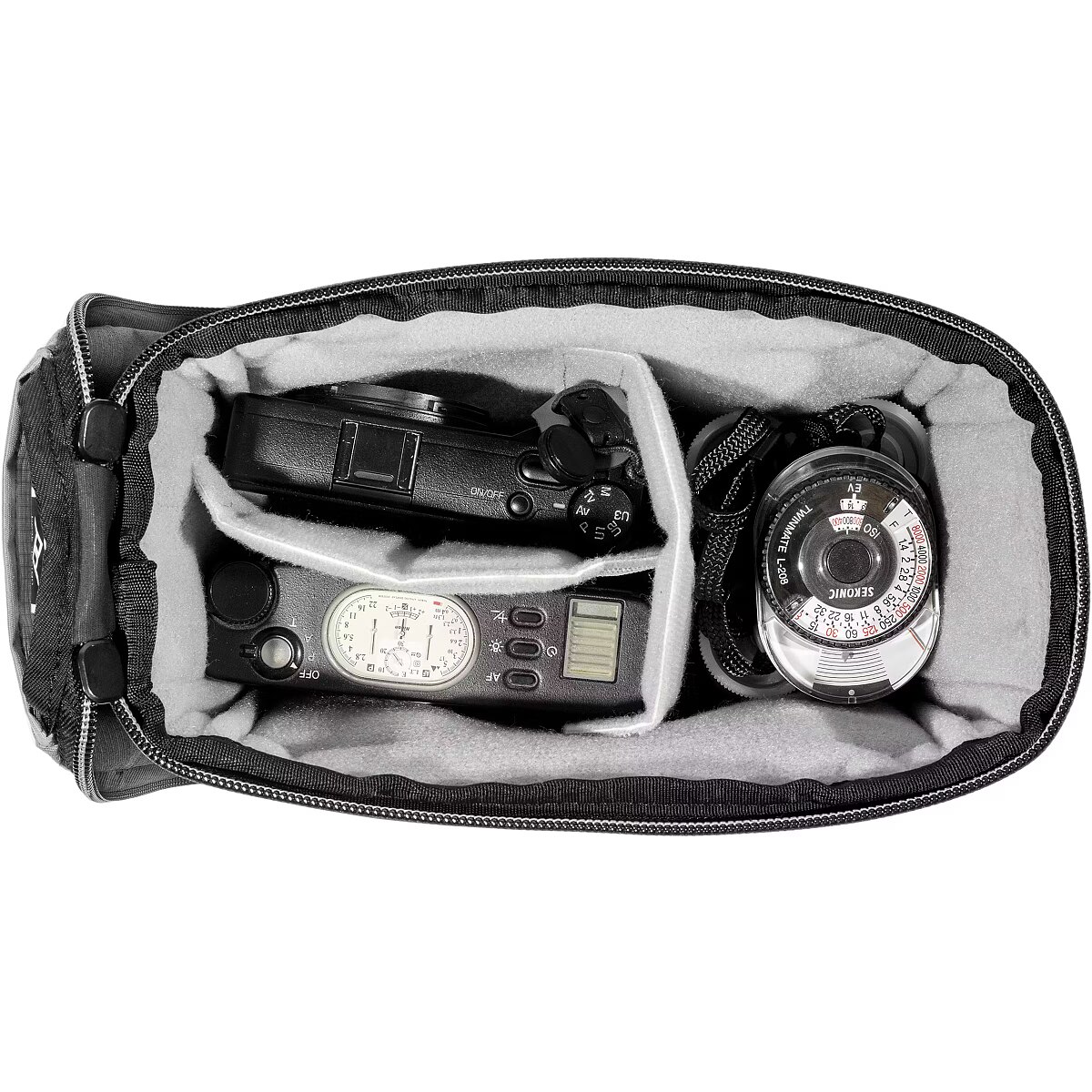 FlexFold dividers enable customizable organization and protection. Vertically stack items for maximal capacity. Floating pocket stores lens caps, filters, and other small items. Convenient carry