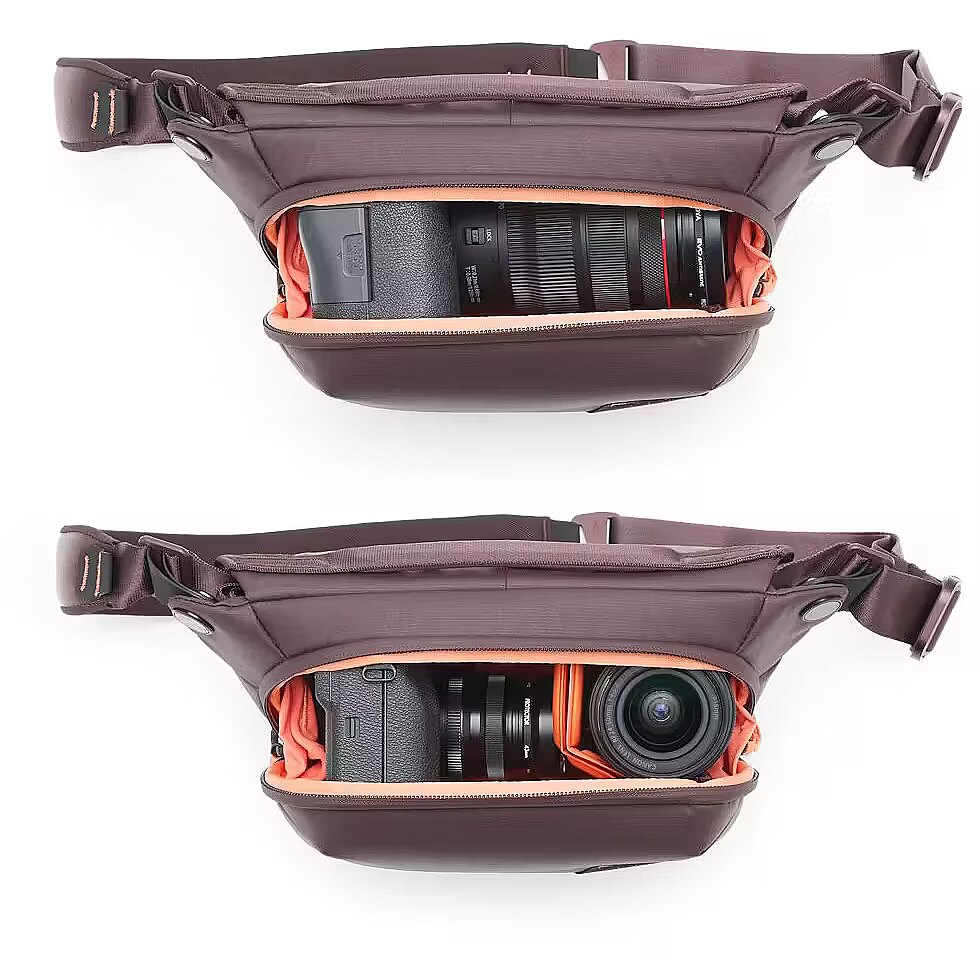 The Peak Design Everyday Sling is designed with adaptability in mind. It features an adjustable, padded shoulder strap for comfortable, hands-free carrying, which can be adjusted for both left and right shoulder use. Additionally, a stabilizing strap can be worn around the chest or waist for added security and convenience. Internal Organization