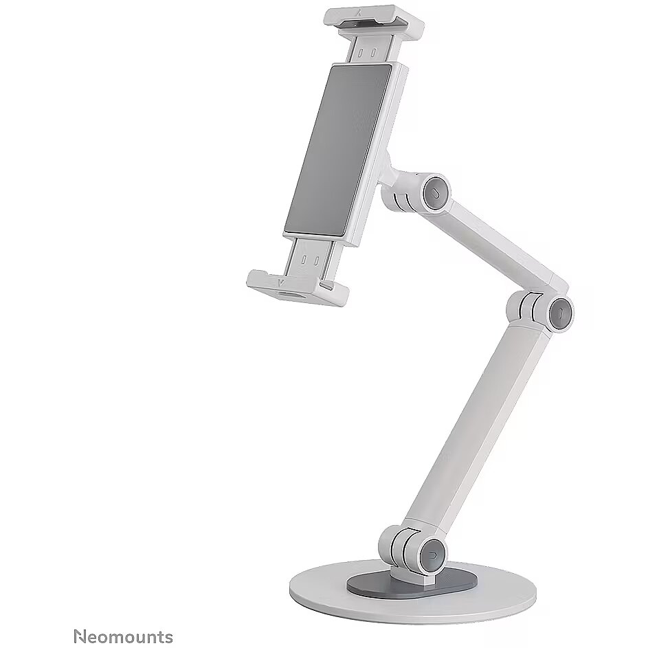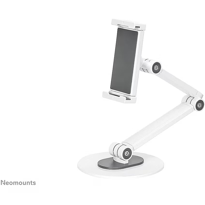 LongDesc - The Neomounts DS15-550WH1 is an universal tablet stand for tablets from 4,7" up to 12,9" with a weight capacity of 1 kg. The tablet stand has 3 pivoting points and is ideal for hands-free video calling, watching a movie or playing a game.The integrated ball joint allows the stand to rotate 360° so you can switch between portrait and landscape position. Additionally, the clever tilt (270°) and swivel (104°) options allow the stand to further change to the ideal viewing angle. Soft rubber pads protect your device from any scratches and the solid base with anti-skid silicon pads ensure solid positioning of your device.