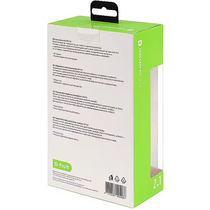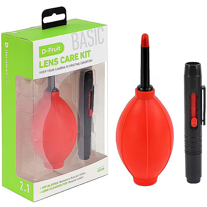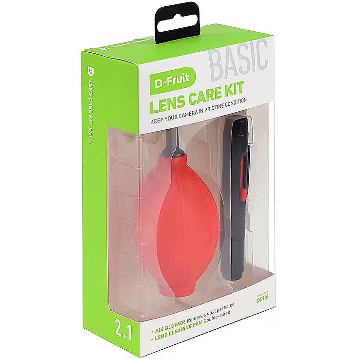 description_et - Iga fotograafi varustuse oluline osa on mitte ainult hea kaamera, vaid ka korralik hooldusvahendite komplekt. Tolm, sõrmejäljed ja muu mustus võivad objektiivi pinnale kogunedes halvendada pildikvaliteeti, põhjustada hägusust või valguspeegeldusi. Regulaarne ja õige puhastamine aitab säilitada maksimaalse teravuse ning tagada, et iga kaader oleks täpselt nii selge ja detailne, nagu peab. See puhastuskomplekt on spetsiaalselt loodud objektiivide turvaliseks hoolduseks ning sobib ka muude optiliste seadmete – nt binoklite, teleskoopide jms seadmete läätsede puhastamiseks. Komplekti kuulub õhupump ja kahepoolne puhastuspliitas. Õhupump eemaldab õrnalt, kuid tõhusalt tolmu ning lahtised osakesed ilma pinda puudutamata, vältides kriimustuste tekkimise ohtu. Kahepoolse puhastuspliiatsi ühes otsas paikneb pehme harjake, mis eemaldab tolmu ka kitsastest ja raskesti ligipääsetavatest kohtadest ning teises otsas on spetsiaalne kuivamiskindel puhastuspadi, mis eemaldab viimsedki jäljed ja määrdumise. D-Fruit Basic Lens Care Kit on ideaalne valik kõigile fotohuvilistele, kes soovivad oma varustust heas seisukorras hoida. Komplektis: Õhupump Kahepoolne puhastuspliiats