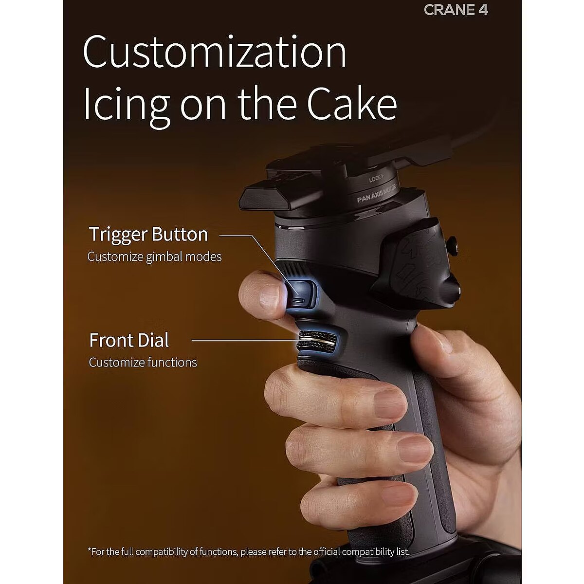 description_en - Stabilizer for large full-frame hybrid cameras and compact cinema cameras Built-in 10 W LED fill light 1.22" color touch screen Sling handle and improved wrist support provide comfort and better control over movement Balance LED indicator on each motor Up to 12 hours of working time, fully charged again in less than 2 hours Wireless Bluetooth connection Weighs 1673 g The Zhiyun Crane 4 gimbal allows filmmakers and content creators to focus on the creative process without being constrained by the weight and capabilities of the camera kit. With a longer handle, stronger motors, an extended quick release plate and a built-in light, the Zhiyun Crane 4 is the optimal solution for filming with larger full-frame sensor hybrid cameras and compact cinema cameras. Thanks to its exceptional stabilization capacity and light and ergonomic design, the Crane 4 stabilizer ensures a more comfortable working position and more precisely controlled movement. More convenient and accurate control