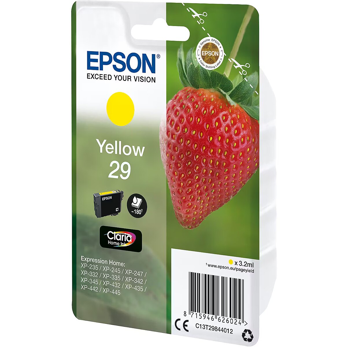ShortSummaryDescription - Epson Strawberry Singlepack Yellow 29 Claria Home Ink, Standard Yield, Yellow, Pigment-based ink, 3.2 ml, 1 pc(s), 180 pages