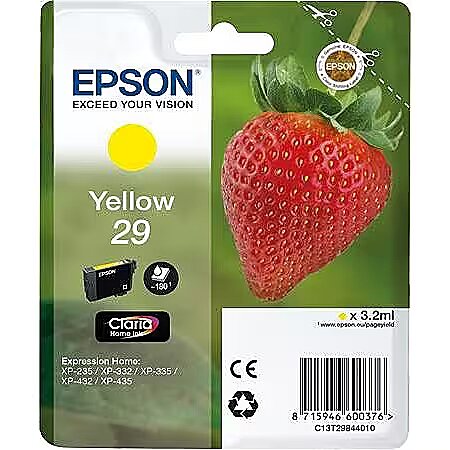 LongSummaryDescription - Epson Strawberry Singlepack Yellow 29 Claria Home Ink. Colour ink type: Pigment-based ink, Cartridge capacity: Standard Yield, Colour ink page yield: 180 pages, Colour ink volume: 3.2 ml, Printing colours: Yellow, Quantity per pack: 1 pc(s)