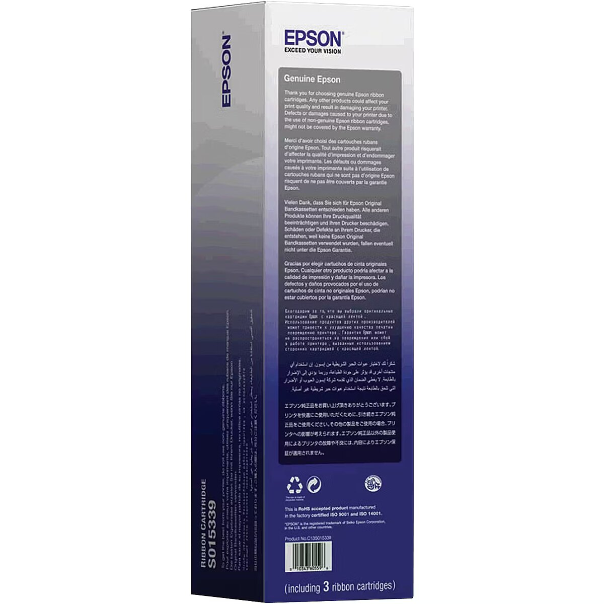 LongDesc - An exact fitting ribbon cassette enables easy and user-friendly replacement and does not jump out during printing. Perfect harmonisation between printer mechanism and ribbon transport means uniform distribution of colour which, in turn, ensures a clean and pleasing appearance and also makes ribbon-tightening a thing of the past.Of course, in the choice of ribbon fabric and mesh thickness, Epson pays special attention to the particular properties of the print head, in order to ensure that the ribbon does not fray and there is no chance of it getting stuck. In addition, costly repairs as a result of defective print heads and cash register breakdowns are avoided.Likewise, Epson places great emphasis on the choice of ink in which the ribbon is soaked: quality of print out, even distribution of colour along the length of the ribbon and predection of the print head pins from mechanical strain and chemical pollution are the important criteria which influence quality and perfect design.Over and above the design, Epson places great importance on quality assurance during the production process. In doing so, Epson guarantees excellent product properties at all times and an optimum harmonisation with the main product - the Epson printer.